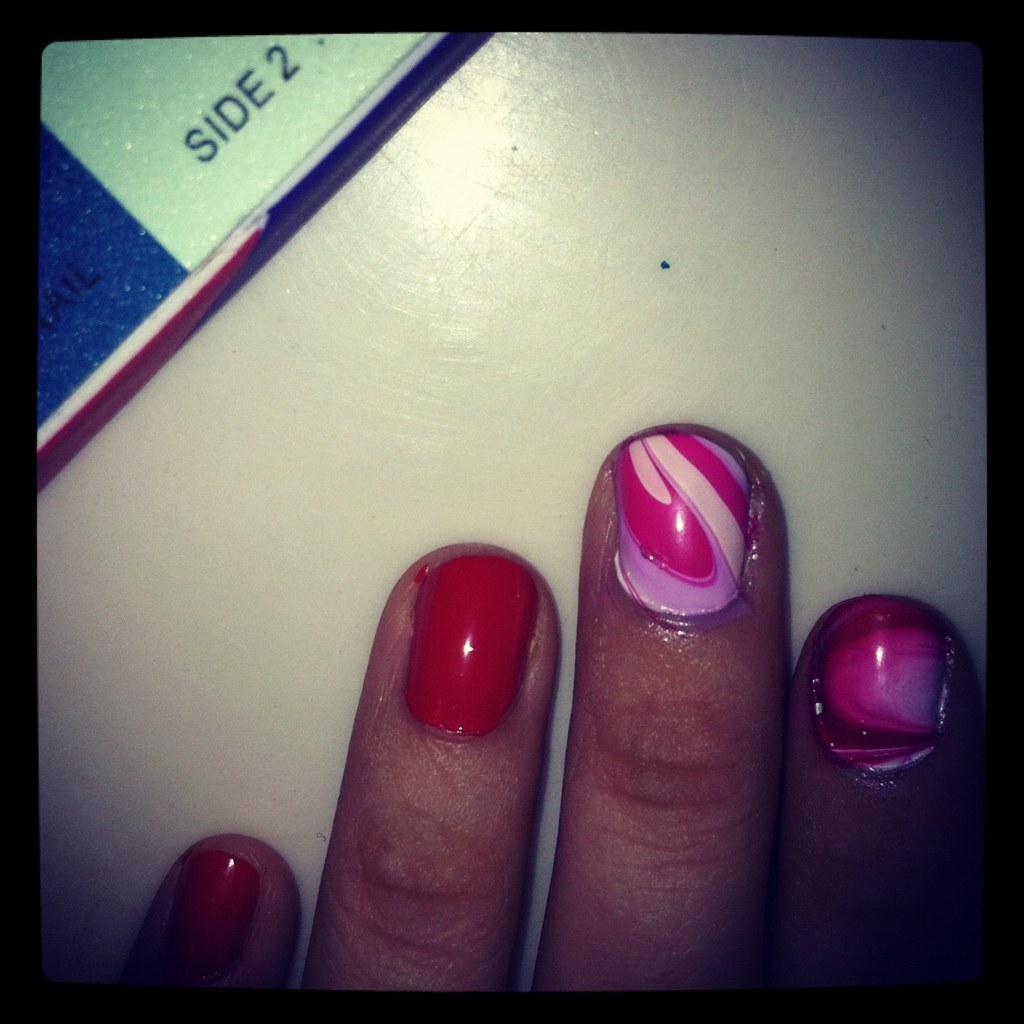 I am not a fake nail kinda girl anymore but I’m all for nail art. I found a DIY for water marbling your nails and it looked so amazing, I had to set an hour aside for myself to try it. There are tons of YouTube videos on it. The only tip I can say that is absolutely imperative for this to work is use a cup or bowl of water that has been sitting out for at least a few hours so that it’s definitely room temperature. Then you’ll have to test out your different colors of polish to see which spread out the best. A toothpick works great at making the designs and clearing the leftover nail polish from the water. A definite head turner.