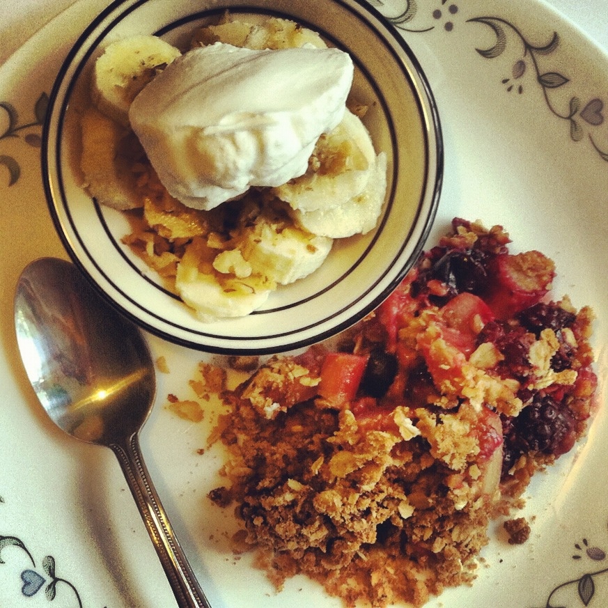 I made a fruit crumble for breakfast the other day. You can make if with fresh or frozen fruit, it’s fairly simple and good any time of year. I used rhubarb, blueberries and blackberries. Oats, brown sugar, chopped nuts (I used walnuts, any kind or combination works) flour and either butter or oil make a fast crumble for the top. Bake until brown and crisp on top and you see the fruit start to bubble around the sides. So yum!