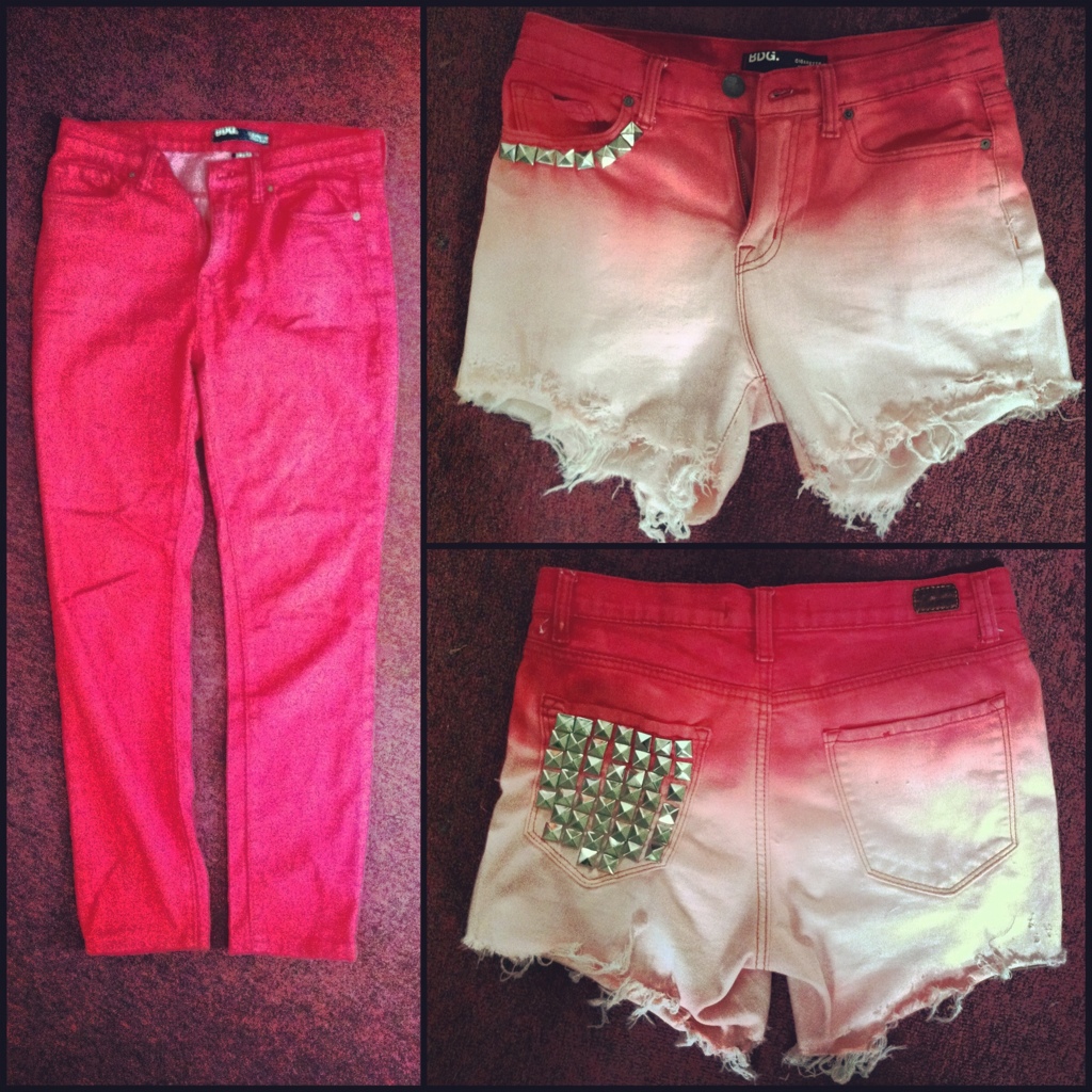 I’m in love with this project! I’m taking all my pants that I’m not crazy about, whether it be the way they fit or color or in general, and sprucing them up into shorts. I bought a huge bag of studs last Christmas and I used the last of them for these shorts. I put a ruler through the belt loops and hung them into a 5 gallon bucket with a gallon of lukewarm water and 2 cups of bleach mixed in. I let them soak for about 6 hours. You can see the color fading although it does happen pretty slowly, just don’t forget about them and leave them over night because they could disintegrate into nothing lol. It’s happened to me before. Fraying the edges was the most tedious part. I used a razor blade and ran in over the edge in all different directions. In total I’d say this project took about 4 hours of active time and 6 just waiting for the bleaching. I’m currently searching the Internet for a bright blue dye to dip dye my next pair. I think I’ll try to do some patches of lace sown on as well.