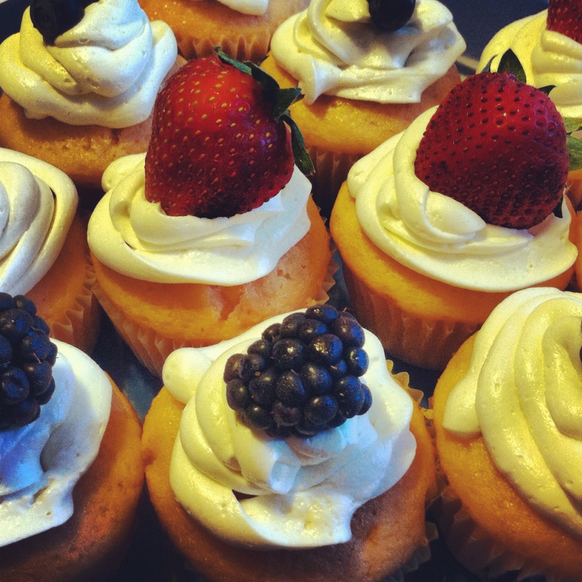 I baked cupcakes last Sunday partially because I had all these fresh berries and I wanted a pretty way to display them and partially because I found this recipe that bragged about the best frosting EVER. I actually think it was the best frosting ever and I’ve been eating it like a slob. I just made a plain vanilla cake and then spent some time whipping up the frosting, literally.