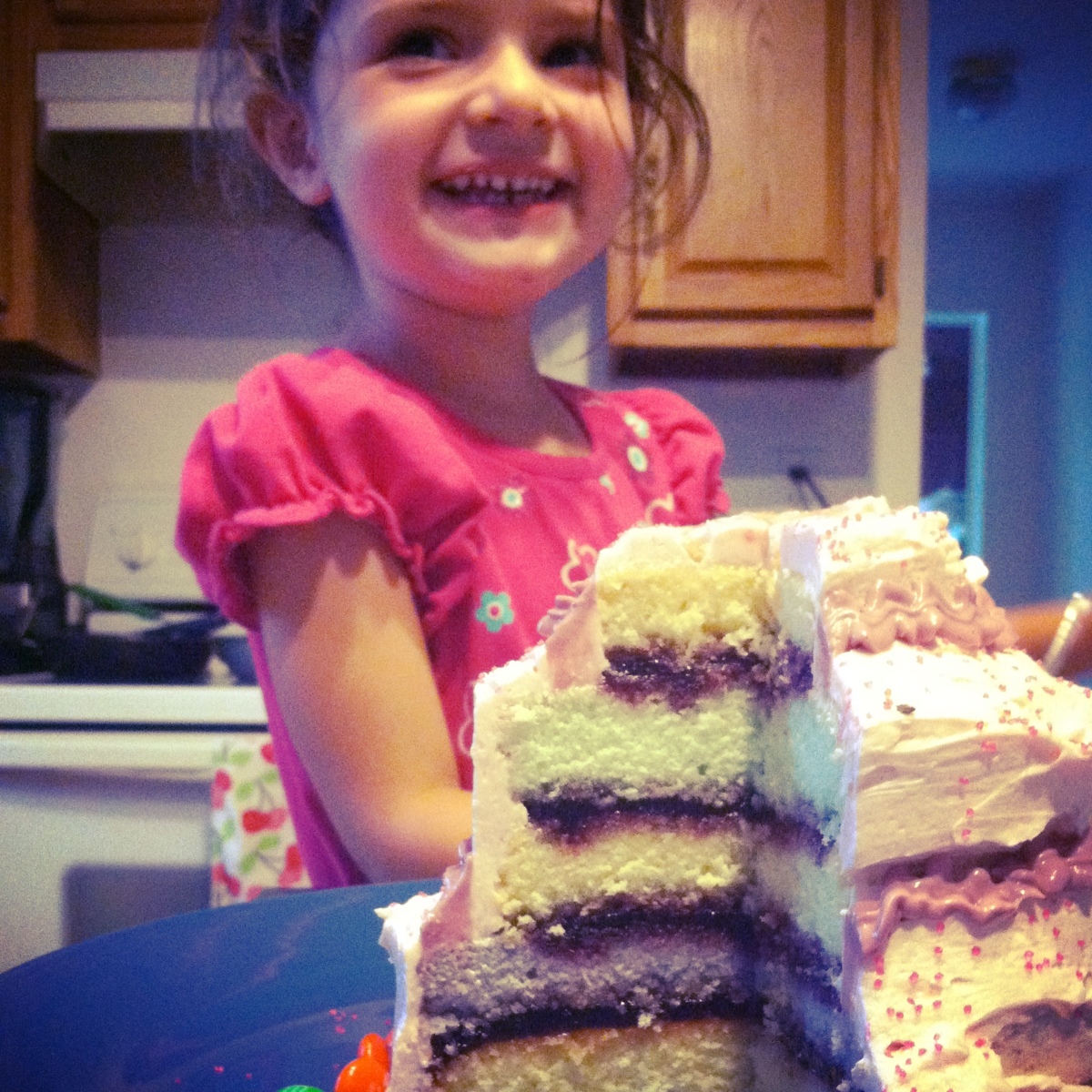 I loved this cake I made for my babes bday. This was the first layer cake I ever made. I bake a lot, especially cakes, but I’ve never done one like this. I used three cake pans; one 9×13 and two 8×8’s. Next time I’m going to buy a few extra aluminum 8×8 pans so I can do more colors at once. I want to try a Martha Stewart recipe for rainbow cake. It looks beautiful but I think I might need to buy some more food coloring. I only have the typical home bakers little four color box. I don’t use them that often, maybe the only time is in frosting. So I made an almond cake for this. I used my favorite vanilla cake recipe and just substituted some almond meal for a small amount of flour and used almond extract. I made blackberry sauce almost like a jam and used it for the filling in between layers. And of course I used my best frosting ever recipe. Here it is again if you didn’t catch it before: