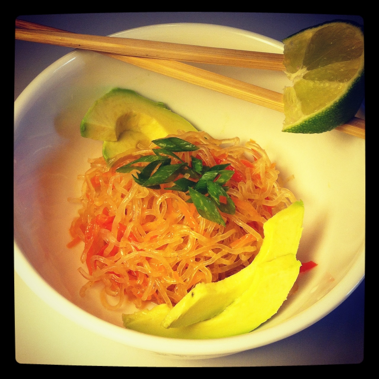 I made the best little noodle bowl yesterday. Gluten free and vegan! Kelp noodles are (duh) made from kelp but they’re not strong in flavor so they go really well with any flavor. The first time I had them I was surprised by the crunchiness because the look like rice noodles and I wasn’t expecting that texture. I made a dressing with peanut butter, miso paste and lime juice, added red and orange bell peppers, avocado and green onion. Great lunch!