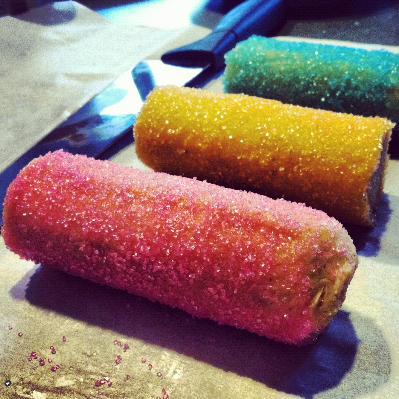 Lightly beat the egg white. Remove the rolls from the tubes. Brush each log with egg white and roll in sanding sugar. If you want to do multiple colors, cut your logs into smaller sizes.
