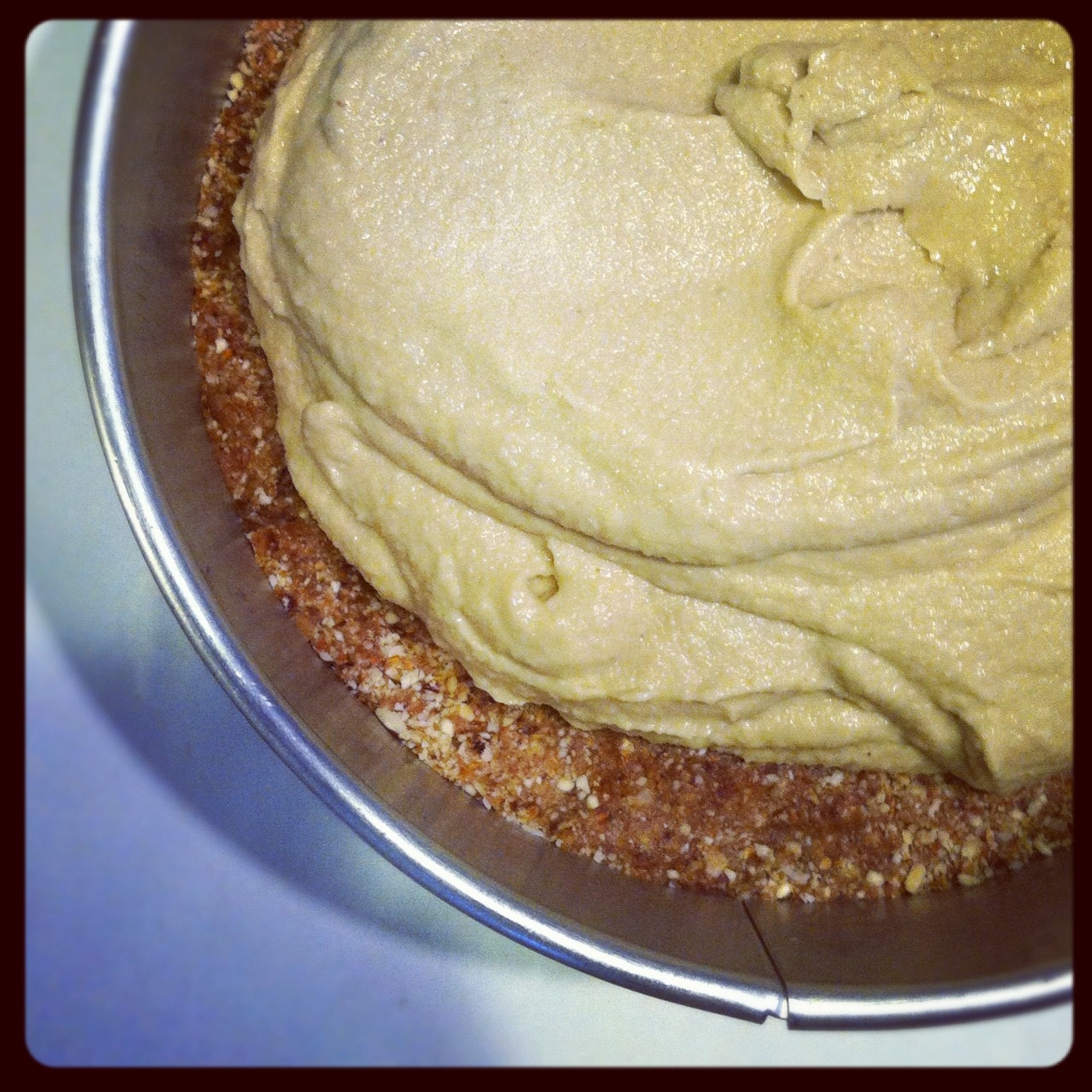 Press the mixture into the bottom of a springform pan, I used a 9 inch round one. Set aside.