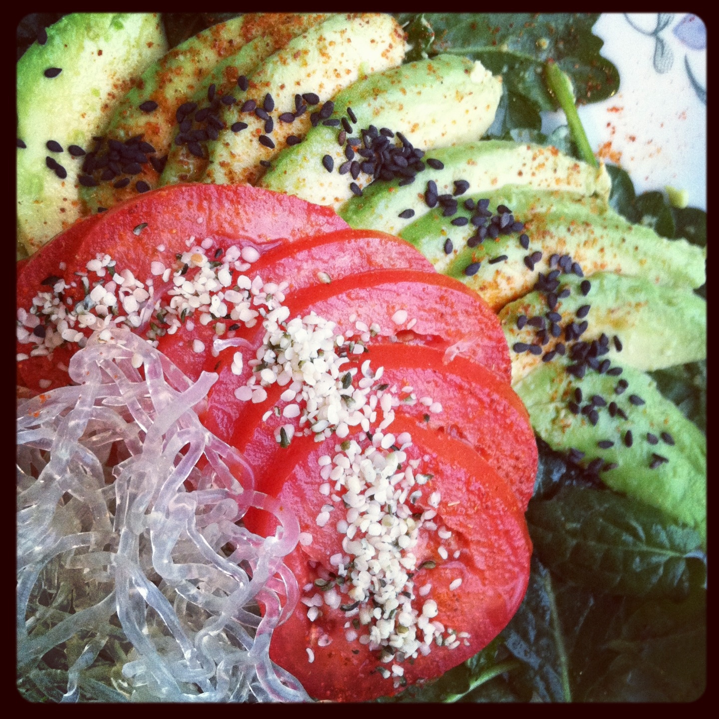 So yesterday after my mushy snow hike, I was in need of some raw goodness. I made a simple salad with baby kale (which is my new favorite salad component!), avocado, tomato and kelp noodles. I squeezed a generous amount of lime all over and massaged my kale with some peanut miso dressing. Sprinkled cayenne, sesame seeds and hemp hearts as well. Tomato & avocado are a classic combo in my book! I can always eat them together, morning, noon or night.