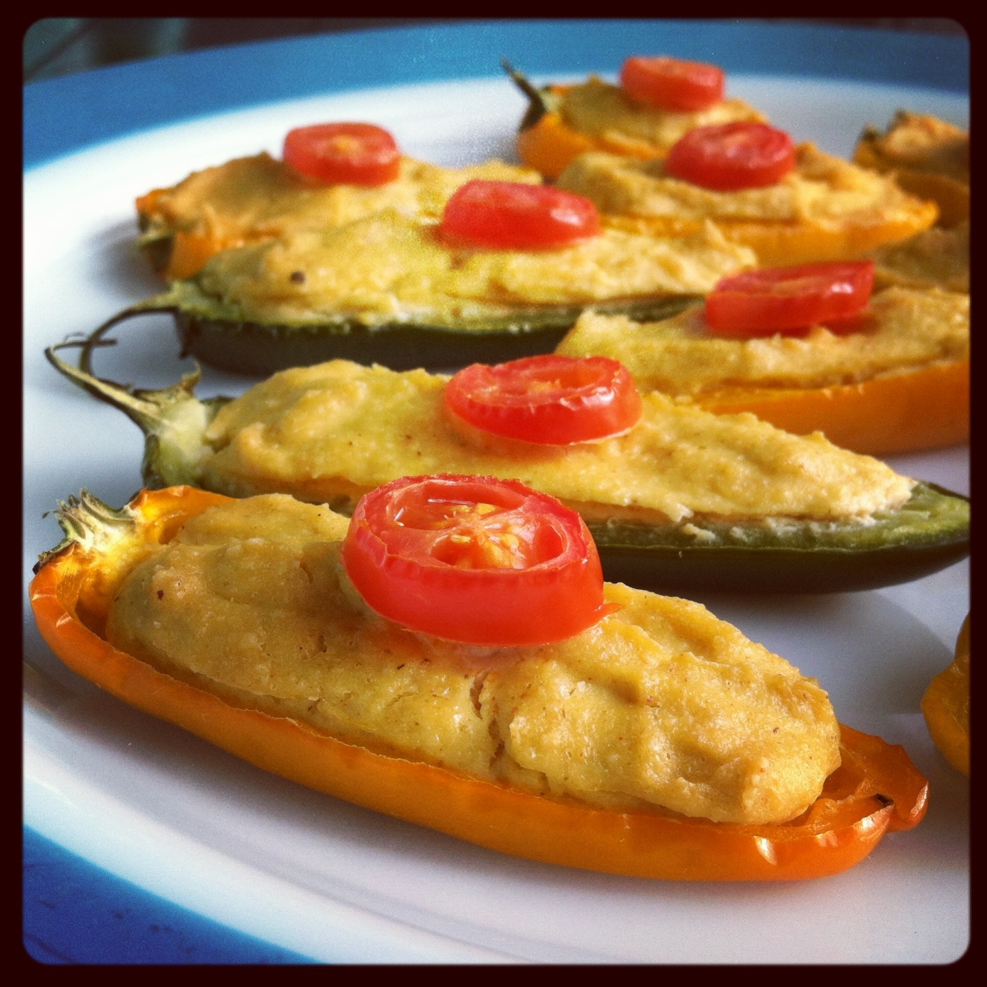 So this recipe for jalapeño poppers sounded pretty good to me. Although I’m not a soy eater, I still wanted to try it. The filling is comprised of tofu mainly. After making it once I know what I’d change for next time. I’m going to post the original recipe and at some point I’ll post my revision. I was thinking of doing a cashew cream instead of tofu…reason being that the filling tasted great before cooking but seemed to get dry after.