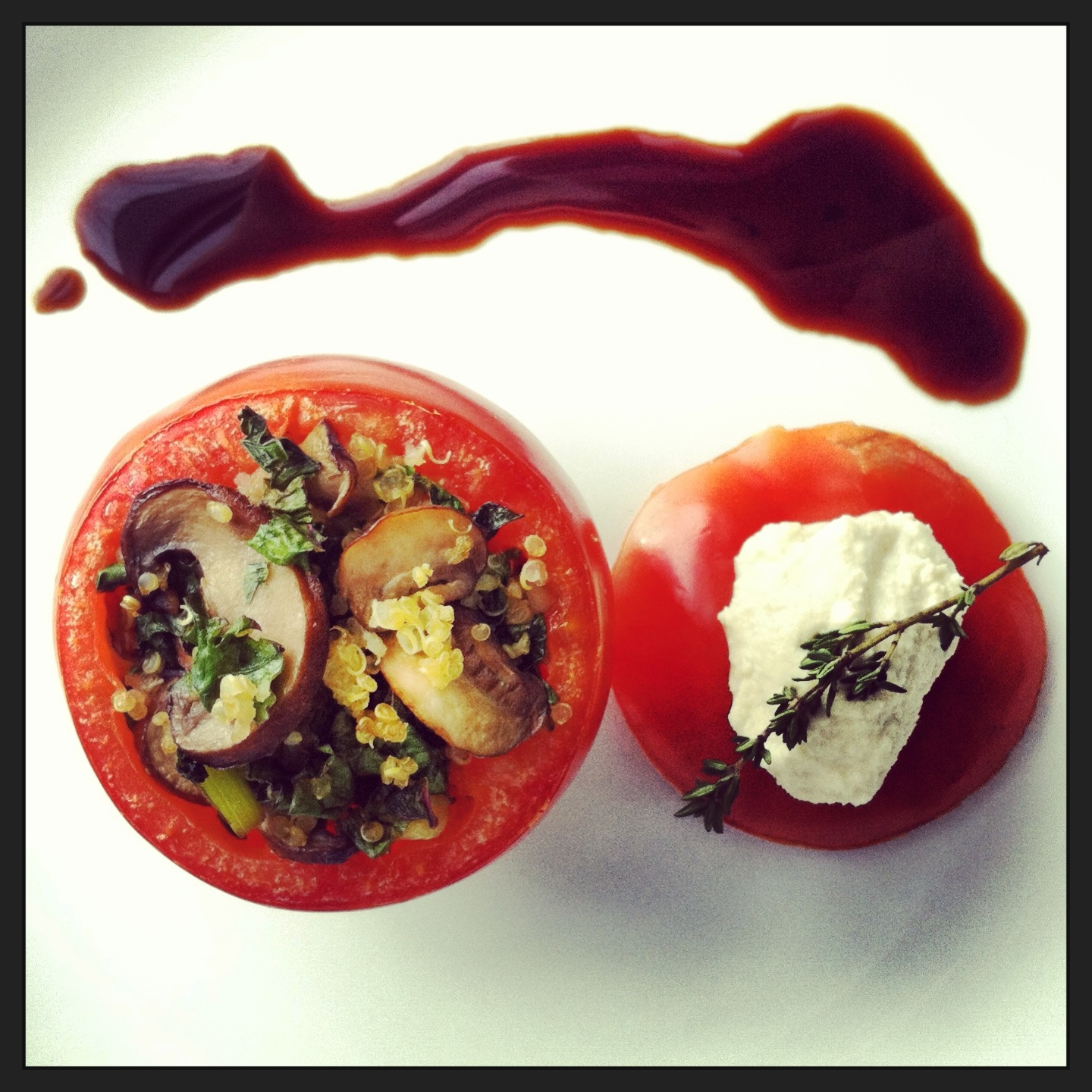 Remove tomatoes and drizzle them with balsamic and fresh thyme.