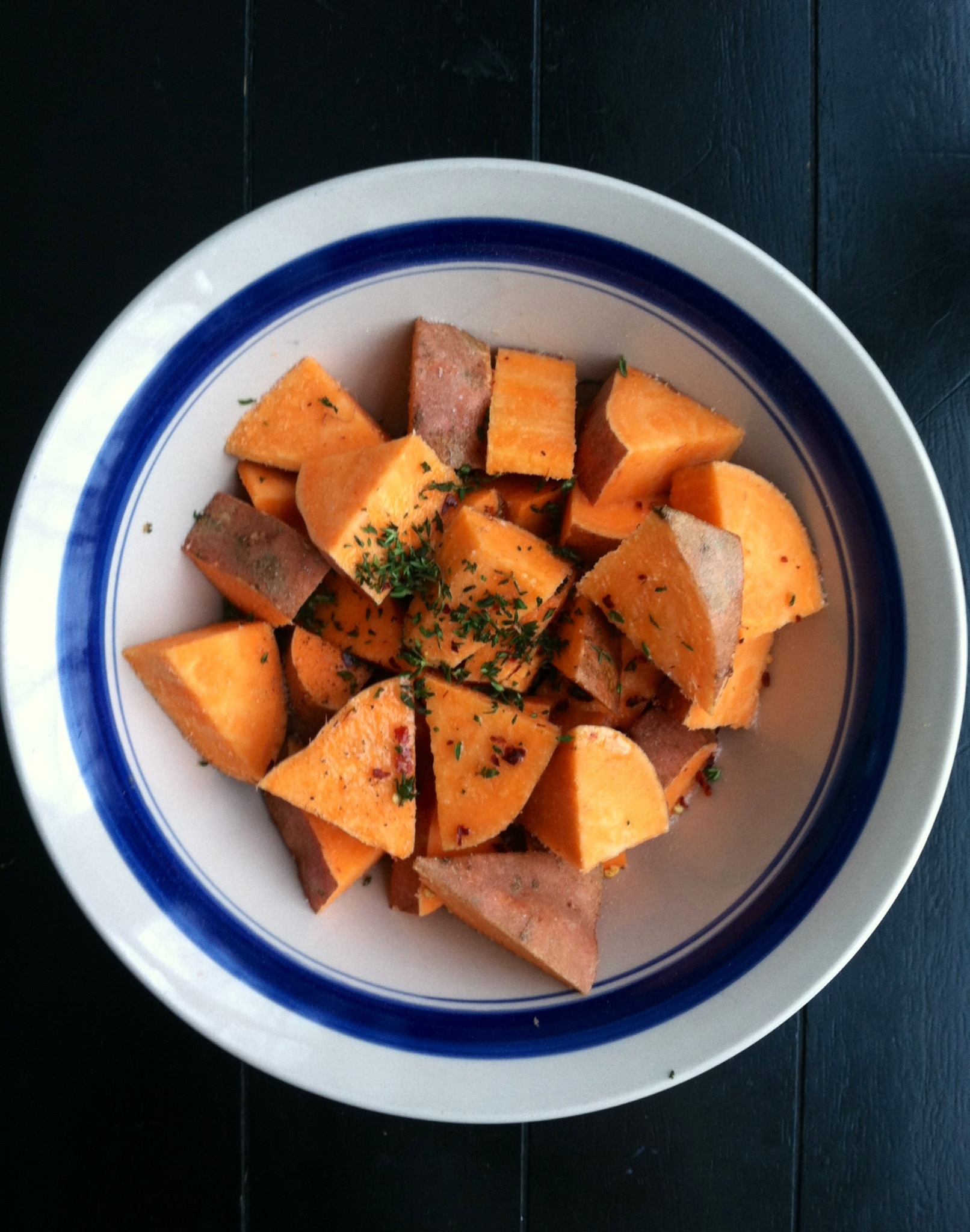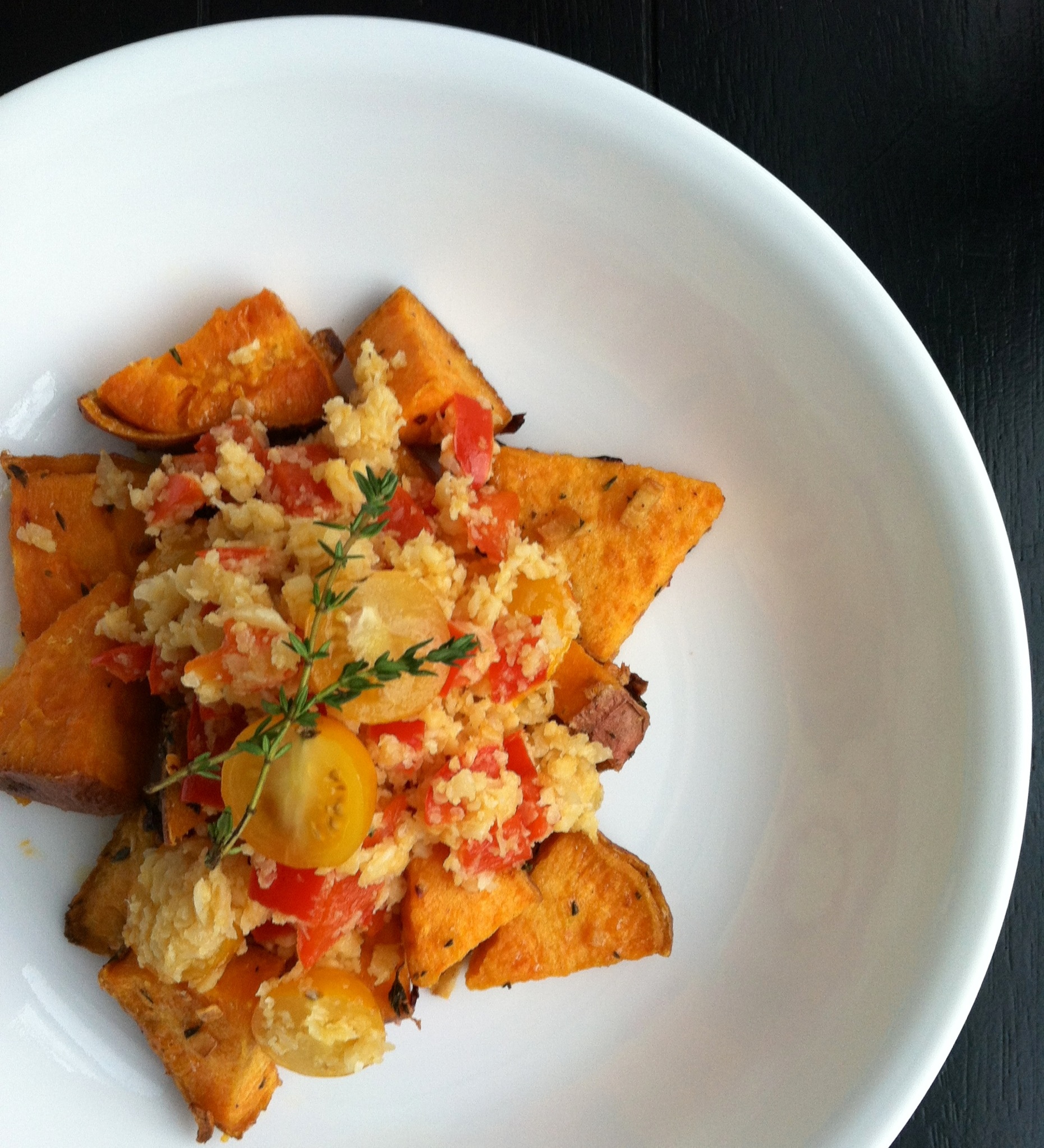 Truthfully, I’m not a big potato eater. Once in a while, when the mood strikes, I whip up some garlicky mashed potatoes or a baked potato with chili and it will satisfy my craving for months. So when I was drooling about sweet potatoes this morning, I ran out to buy a few. I always get the most specific cravings for things; today it happened to be spicy roasted sweet potatoes with garlic. I really wanted to taste the sweetness of the potato with the savory garlic. Salty and spicy. I thought a hash of grated cauliflower (couscous style), red bell pepper and sweet yellow cherry tomatoes would go well on top.