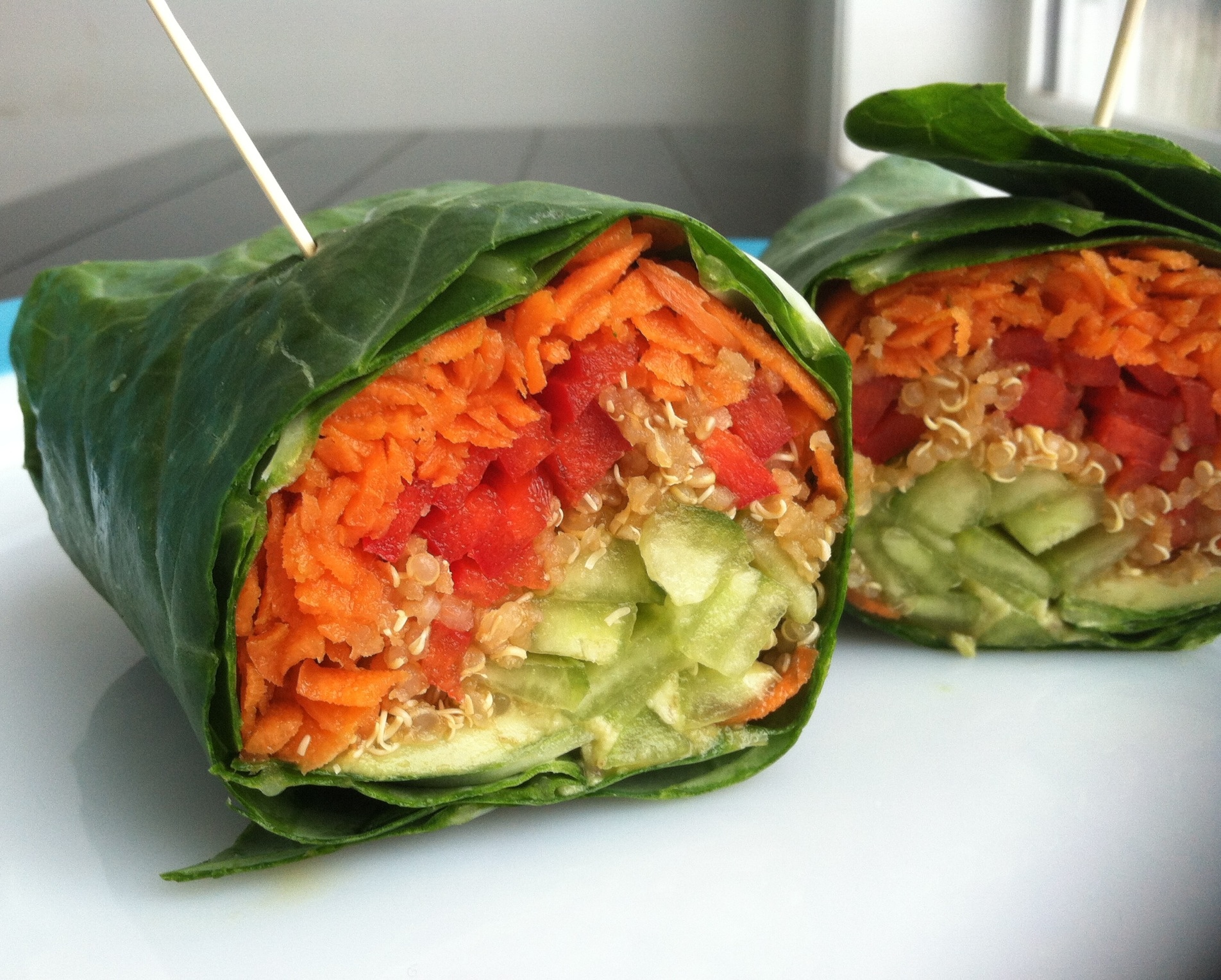I used large collard green leaves to make a veggie & quinoa wrap for lunch.
