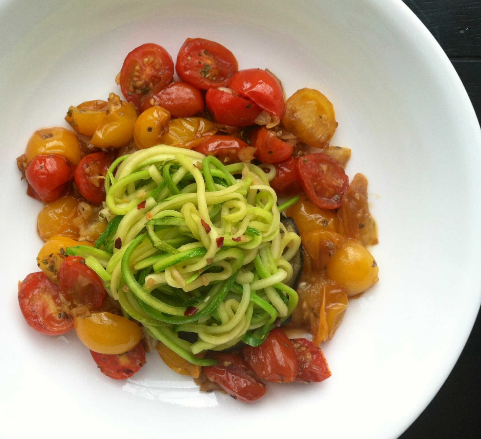 I love using my julienne peeler to make zucchini or cucumber pasta. Depending on whether I’m in the mood for a hot or cold dish (wanted a hot one today) I choose between the two veggies and go from there. I bought a few pints of red and yellow cherry tomatoes and figured what better way to pair zucchini and tomatoes than balsamic?! You can’t go wrong with that combination. Especially with some roasted garlic and red pepper flakes…mmm.