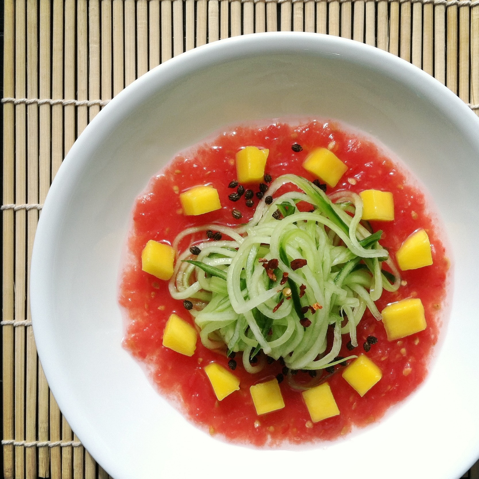 My nana always served this with Italian bread for dipping. As good as it is like that, I think I’ll opt for some cucumber spaghetti and mango. Yes, a bit odd with the mango but I thought it would be a nice counterpart to the garlic and cucumber.