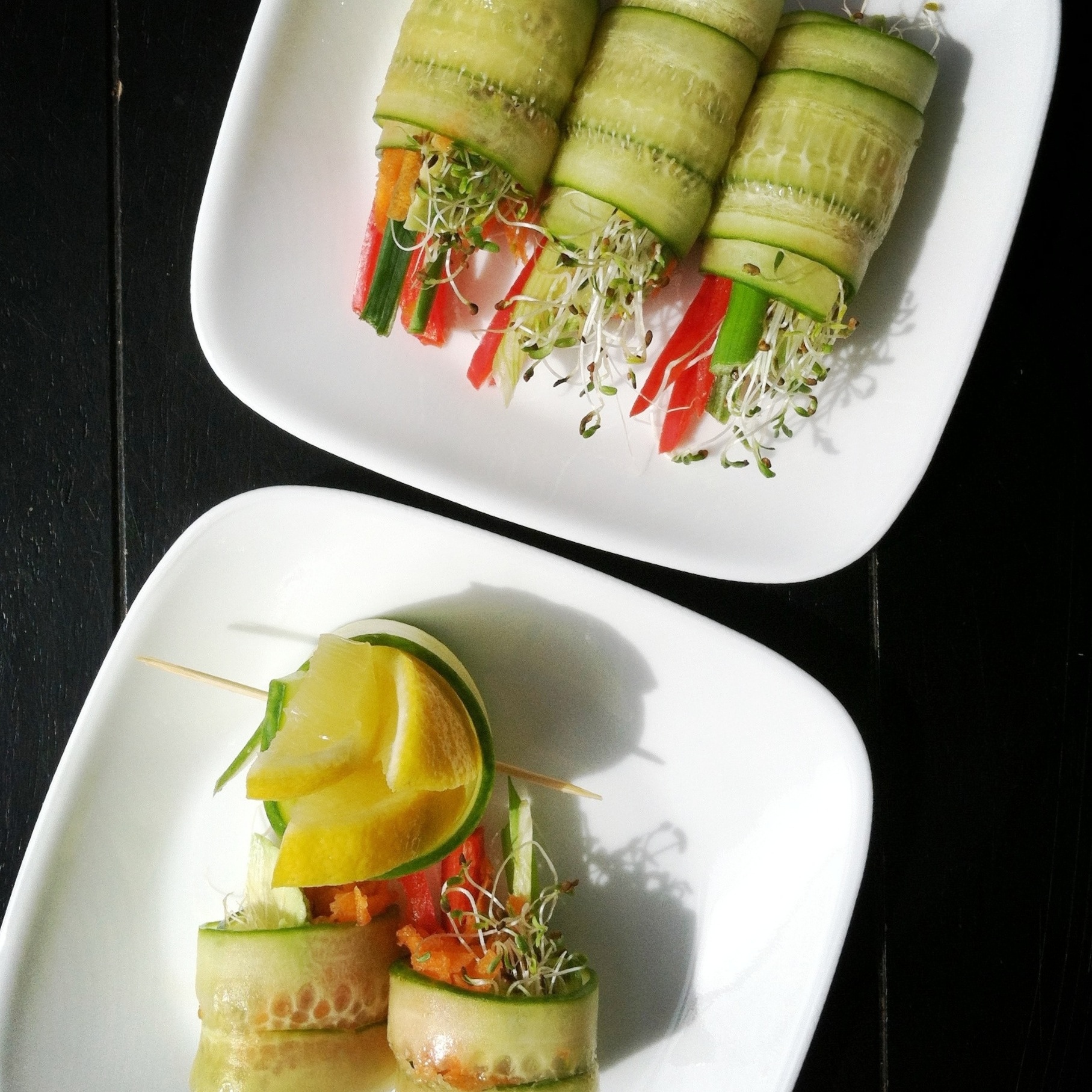 I used my mandolin to make thin slices out of a European cucumber, unpeeled because it was organic. I laid two slices parallel to each other and overlapping halfway, just to create a larger surface.