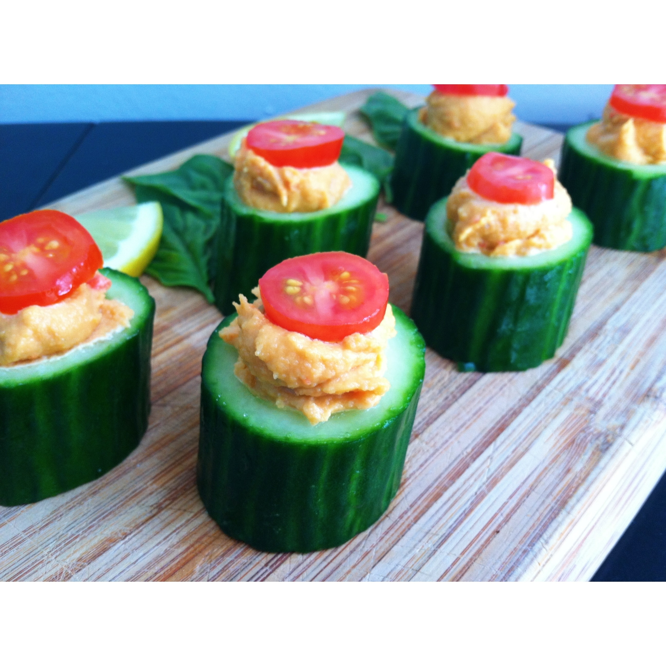 I filled my cucumber cups with a nooch & bell pepper cashew cream and topped with tomato & basil.