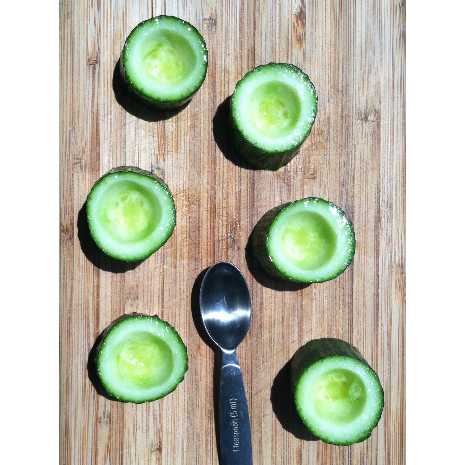Using a melon baller or a teaspoon, scoop out a bowl shape in each cucumber round, being careful not to scoop all the way through to the bottom.