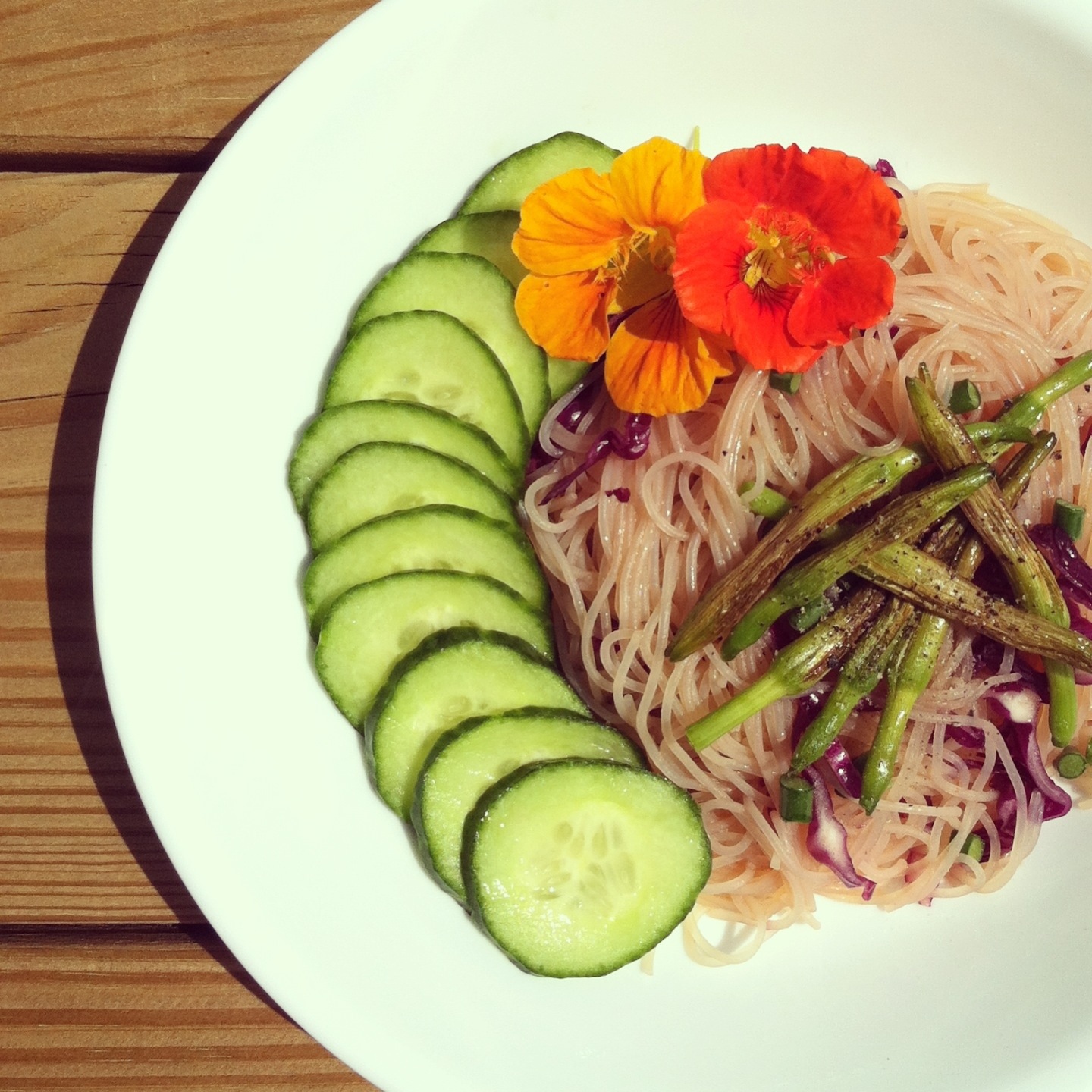I had these with rice noodles and a miso lime dressing with red cabbage and scapes. I love the garlicky flavor scapes add to my dishes without overpowering the other flavors.