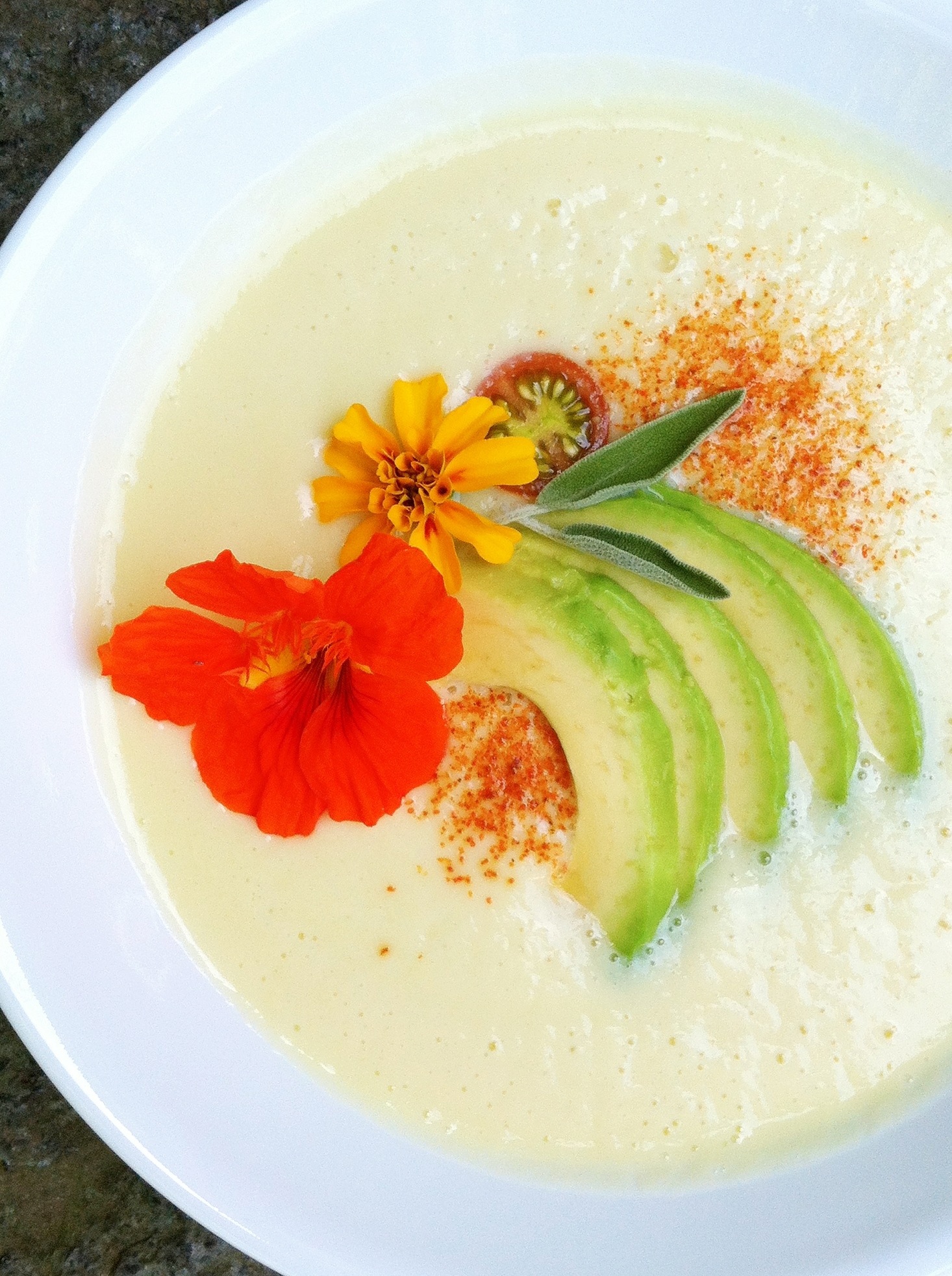 Serve with any garnish in season, I used nasturtiums, marigolds, tomato, avocado and smoked paprika. Pea shoots or fried sage would be a great addition as well!