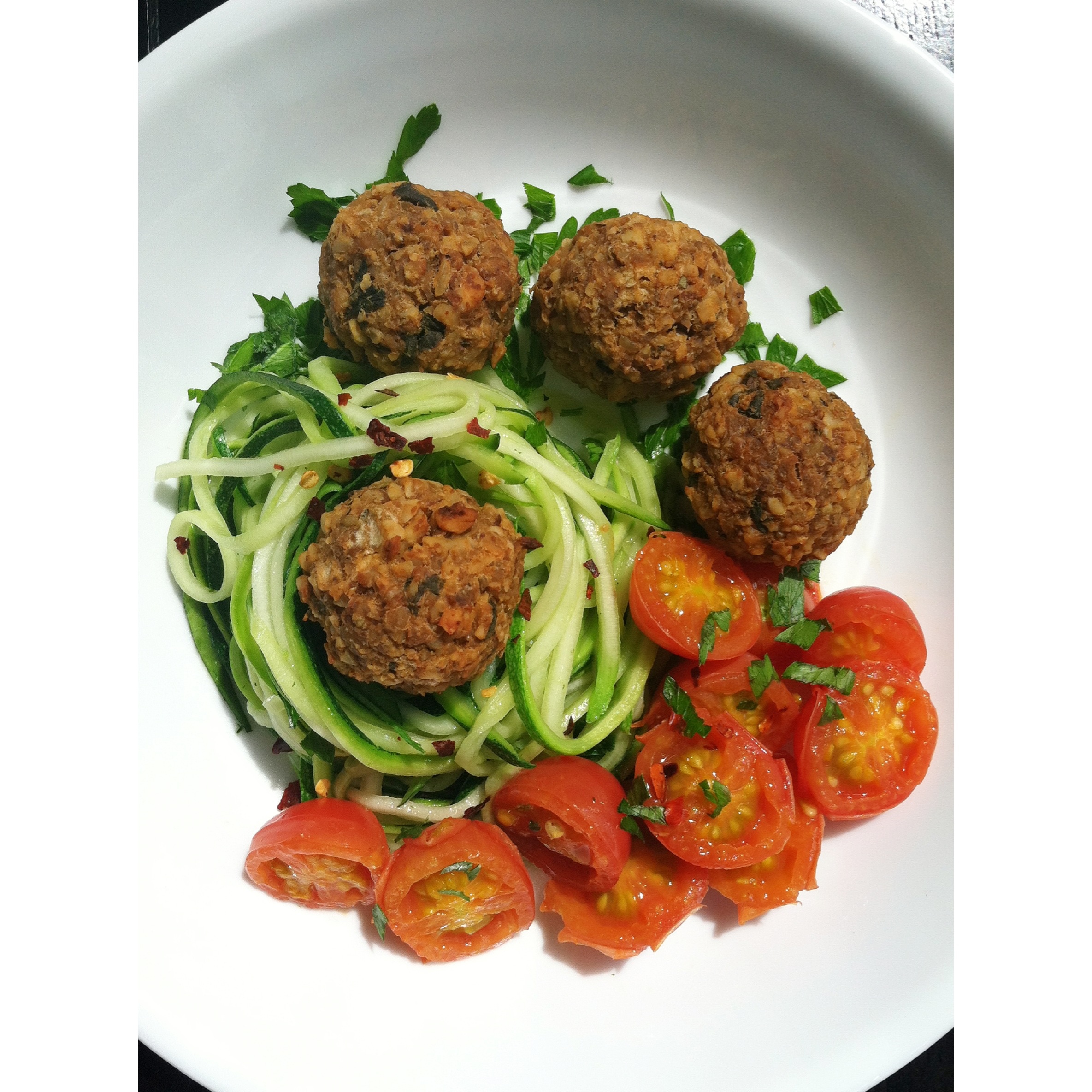 Tempeh-Walnut Balls. [with zucchini linguine]