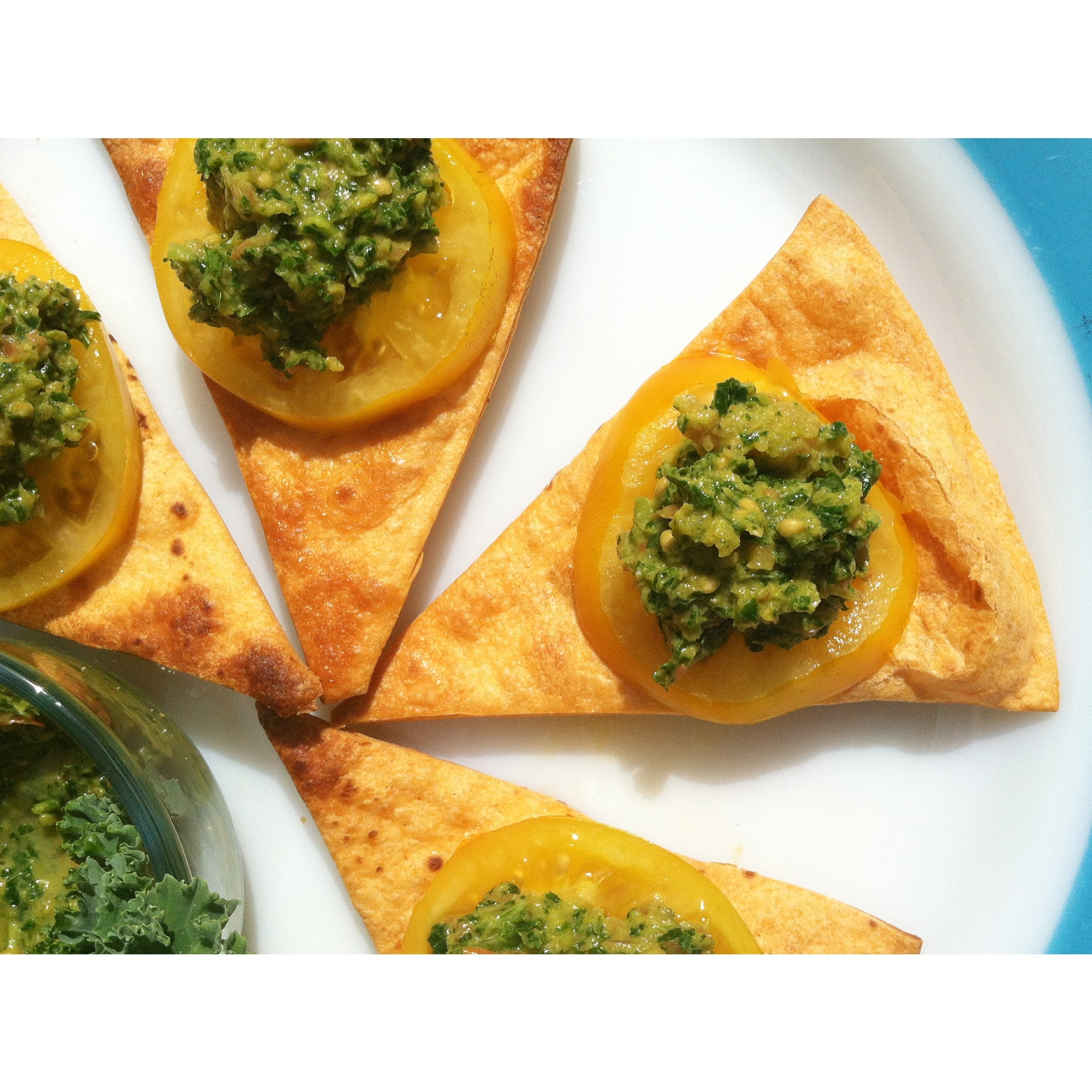 I baked oil brushed tortillas at 350 degrees, sprinkled with a little salt, to use for dipping. Sliced a perfectly ripe ‘lemon boy’ tomato and put those on there as well.