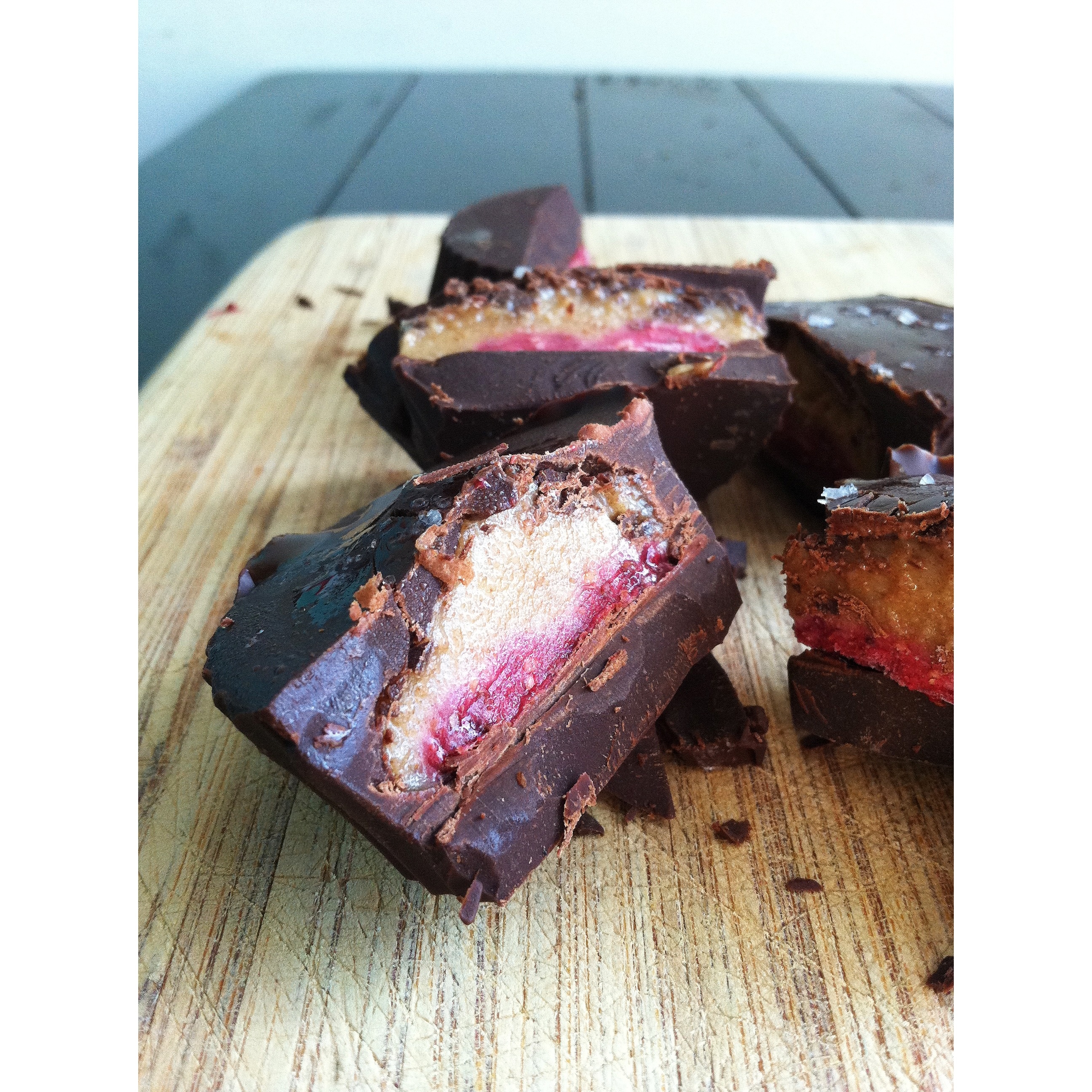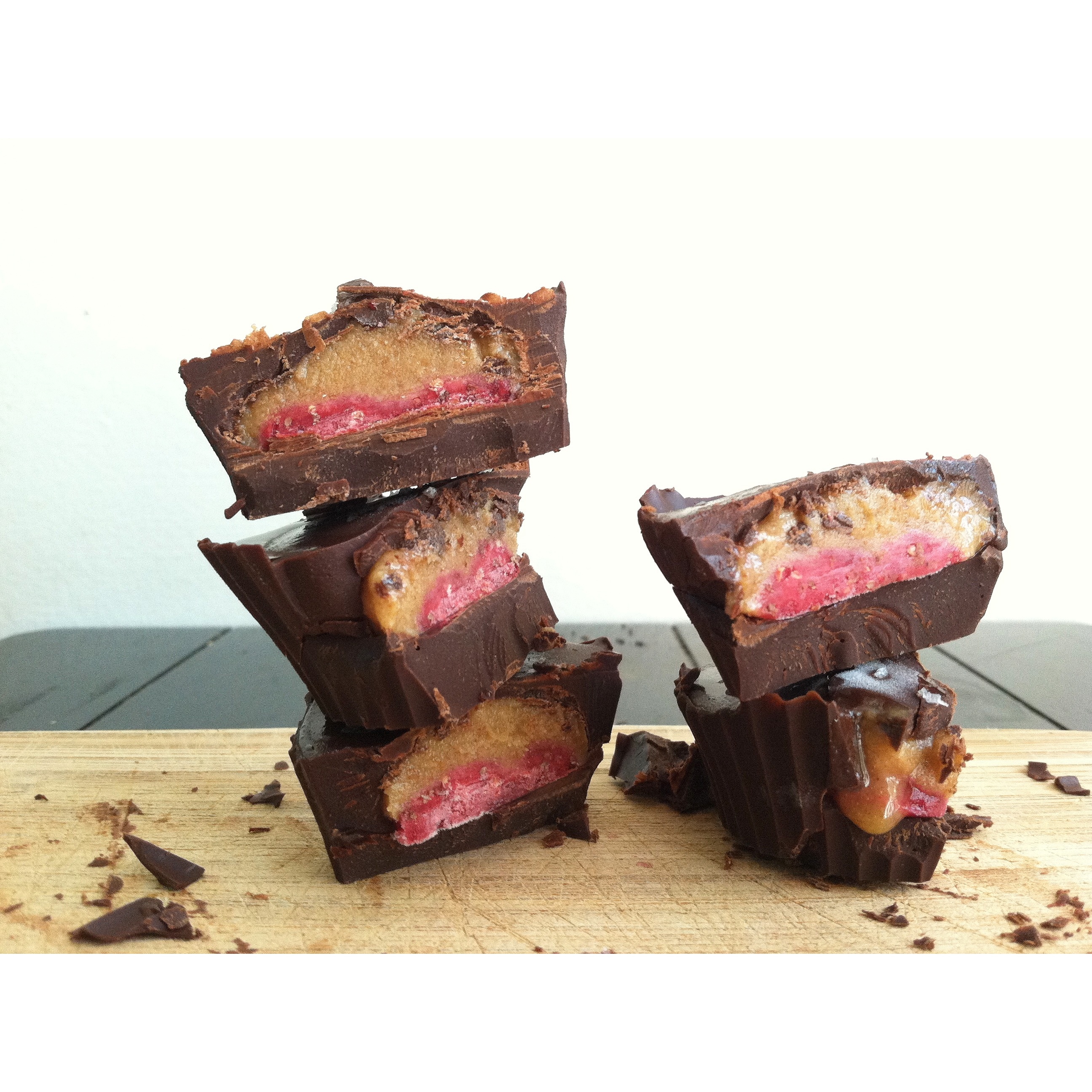 Salted Date Caramel & Raspberry Chia Jam Chocolate Cups.