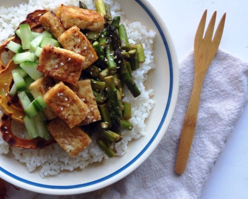Above ^ I paired the tofu with sushi rice, roasted delicata squash, raw cucumber and stir fried asparagus.