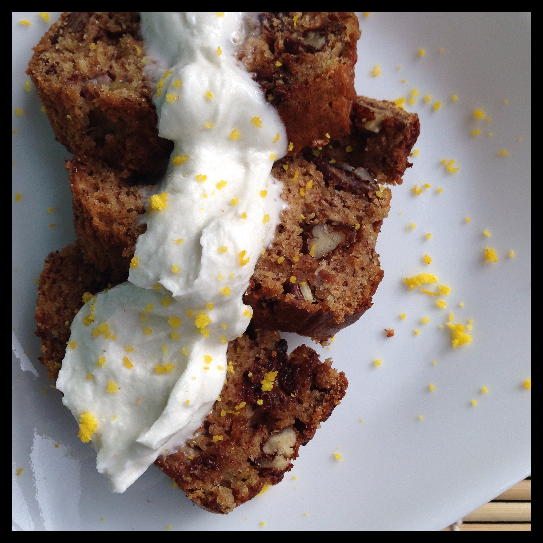 I whipped together 1/2 c of coconut cream (what you get when you leave a can of full fat coconut milk in the fridge overnight, the thick cream will rise to the top) and 1 tablespoon of maple syrup. Just to have a creamy glaze if you want. It’s a nice addition but not necessary in the least. Also some added orange zest never hurts!