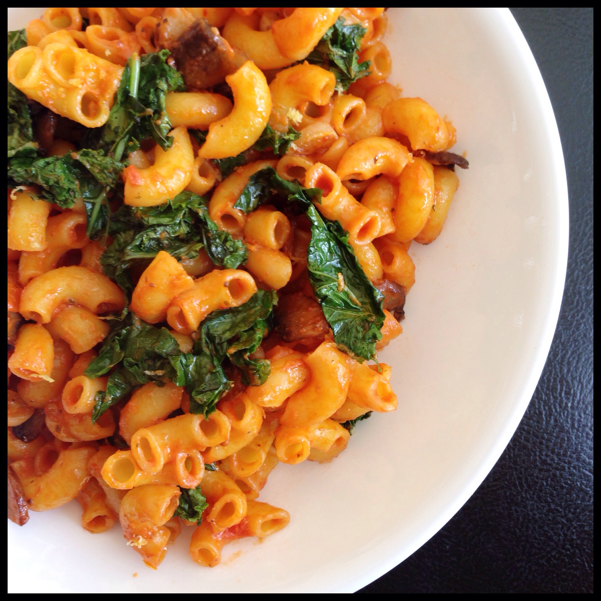 So of course there’s kale in everything now, being that it’s winter time in the northeast. I decided on kale, mushrooms and garlic for our quinoa pasta lunch.