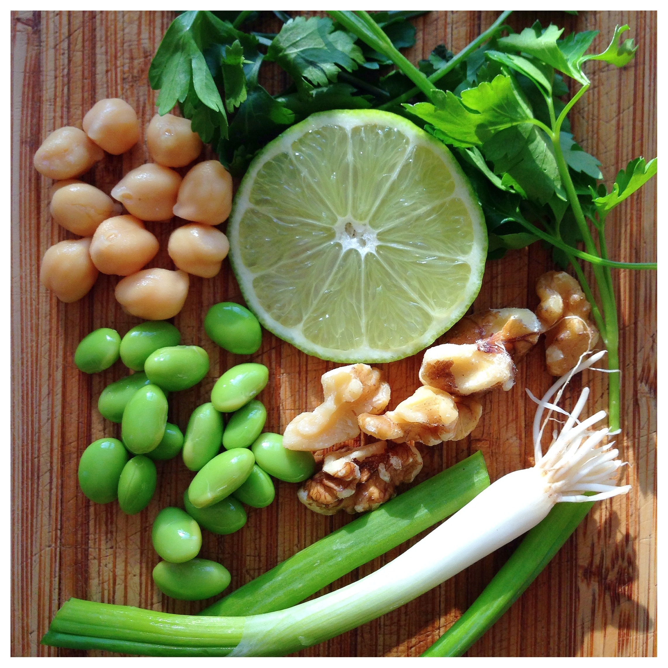 Combine chickpeas, edemame, parsley, basil and walnuts in a food processor.