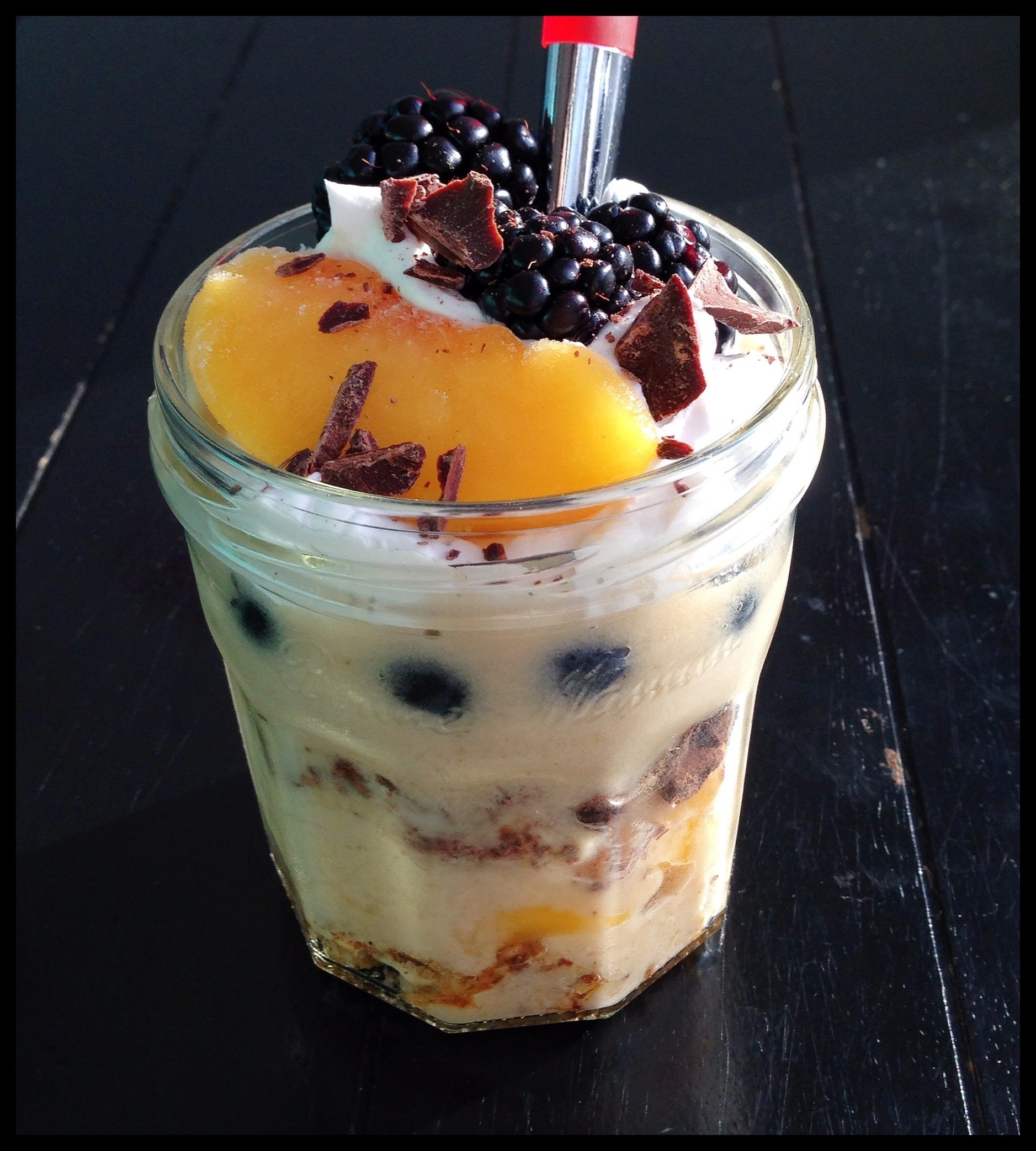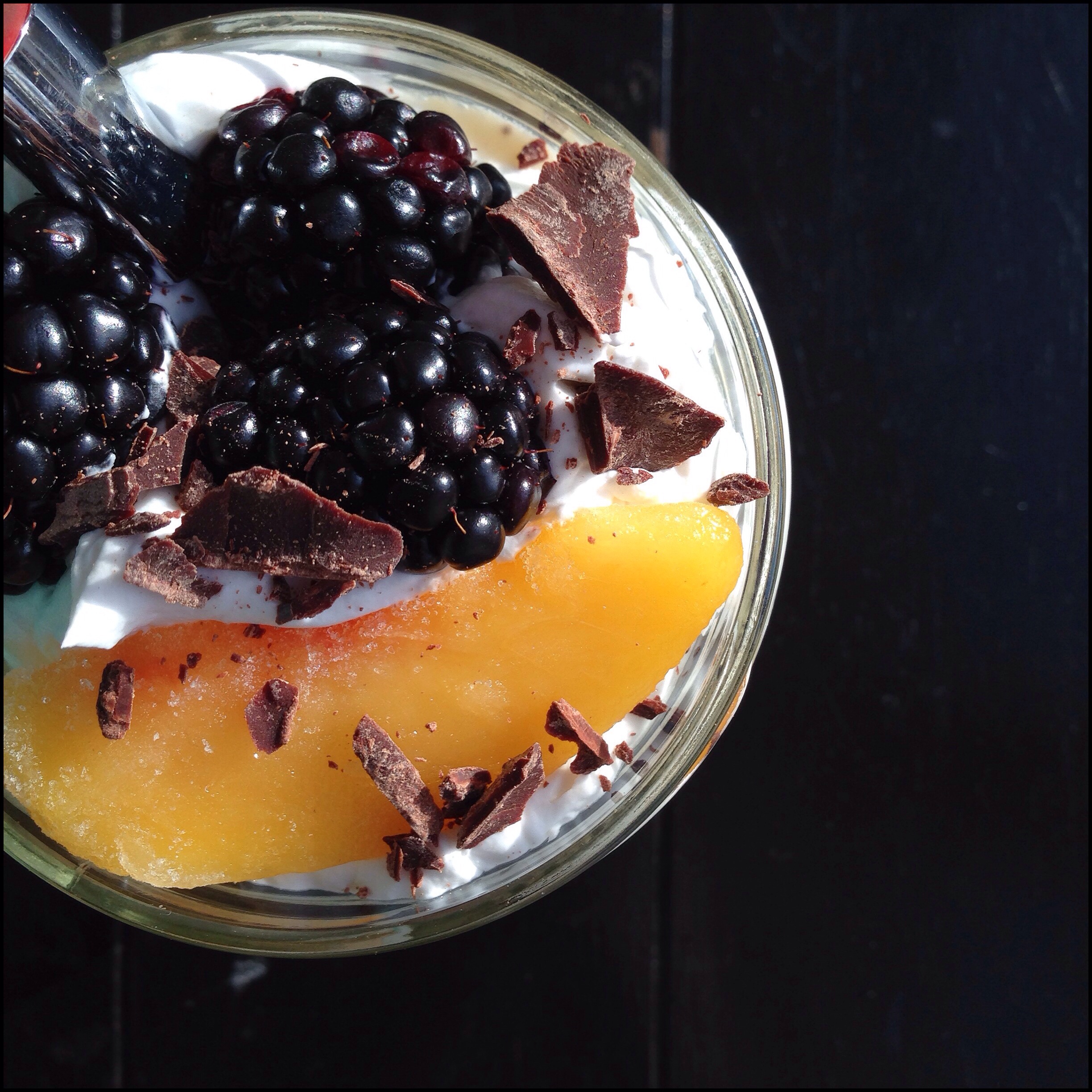 Make as many layers of each as you want, until you run out. I like to top it all with a little fresh or frozen fruit, for contrast as well as some tartness! Raspberries, strawberries or pomegranate work great. I put a layer of blueberries in the middle there too.
