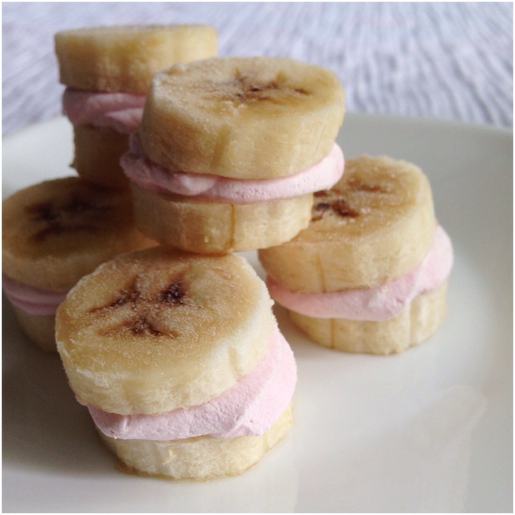 I sliced bananas 1/2-1/4 inch thick, piped about a tablespoon of coconut cream onto one and gently laid another slice on top. I should have cleaned up the edges where the coconut cream protruded out but I’ll remember for next time. Minus 3 points for neatness.