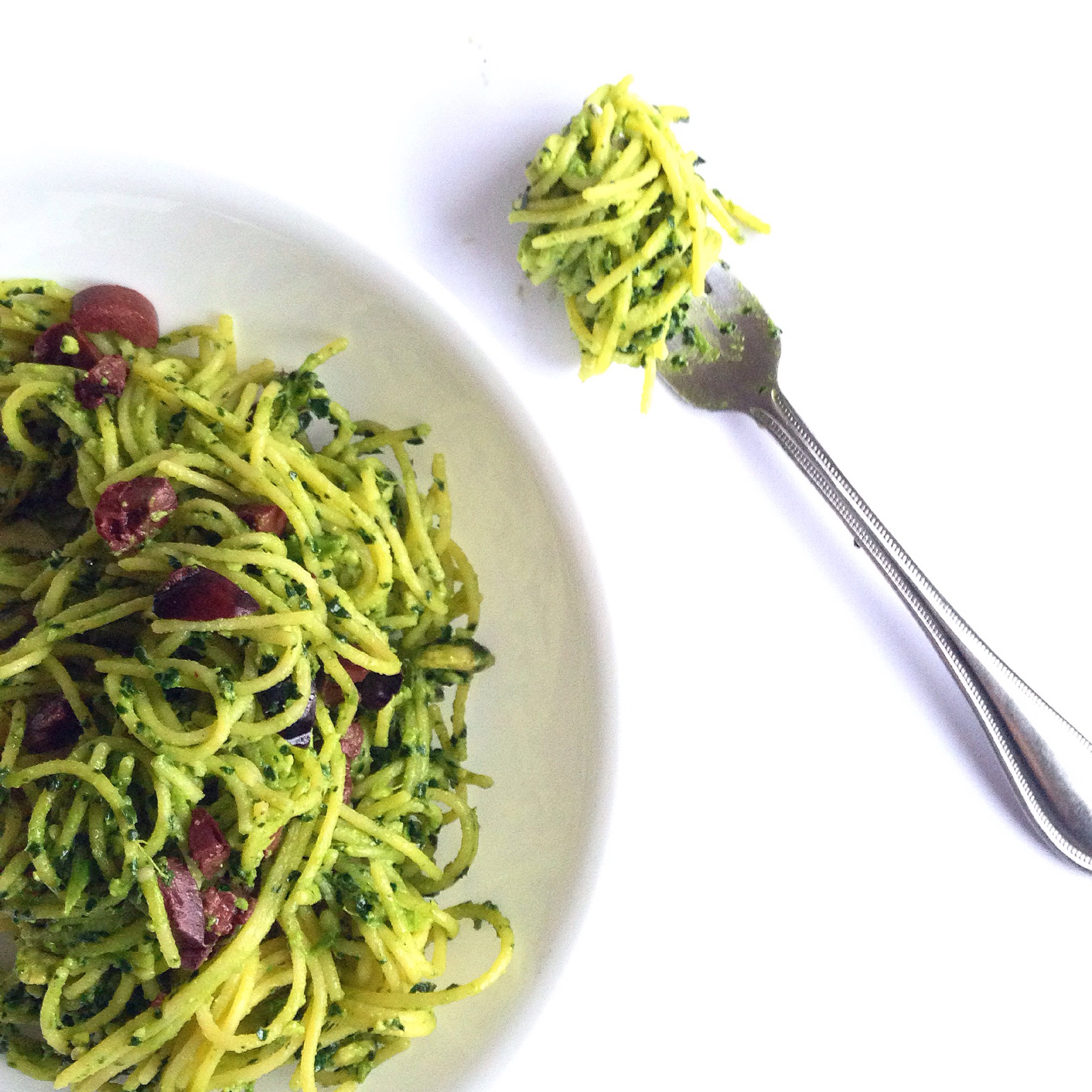 I added in the option of using olives here in two ways; either add them into the blender with the other ingredients for another salty flavor or if you’re going to toss the pesto with some pasta, just toss them in as well.