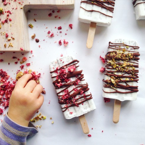 Drizzle the chocolate over the popsicles and after a few minutes they should be hard enough to wrap up and stick back into the freezer. (they won’t fit back into the molds so don’t even try π )