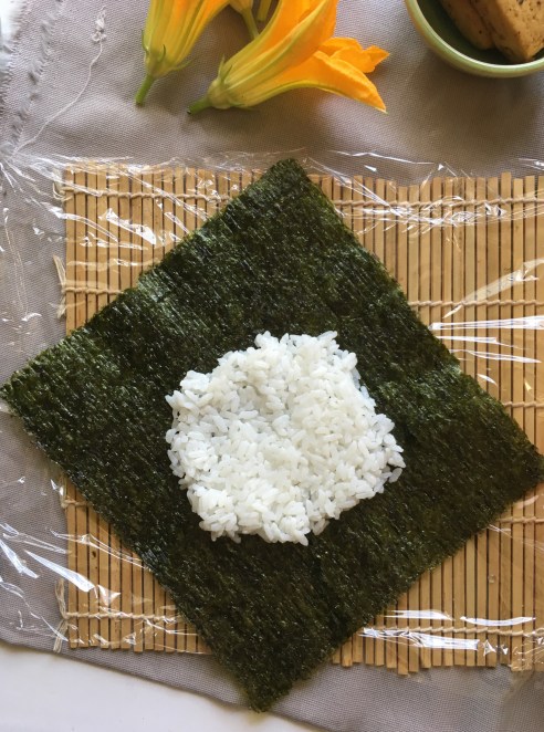 Lay down one square foot of plastic wrap on a clean, flat surface. On top of that, lay down one sheet of nori, shiny side down (like always when you’re making sushi). No, you don’t need that bamboo sushi mat I have down there; I just used it for aesthetics.