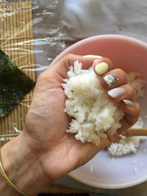 Have a kitchen towel nearby, a small bowl filled with lukewarm water to dip your hands in, your sushi rice, and all your sushi filling ingredients ready to go.