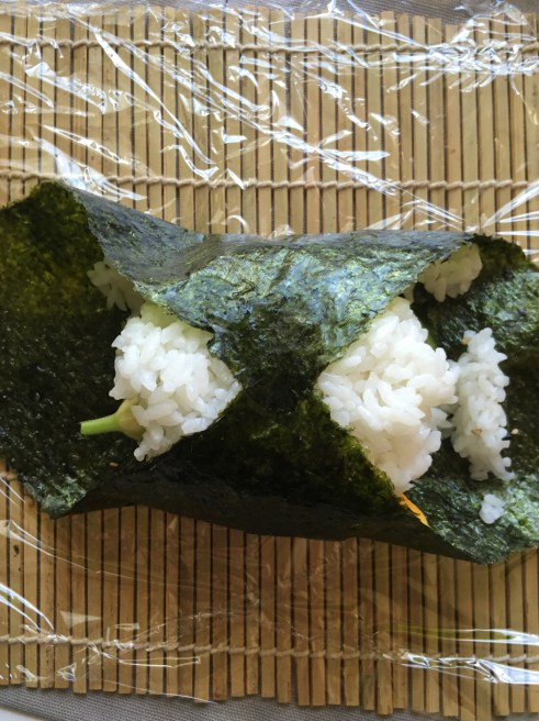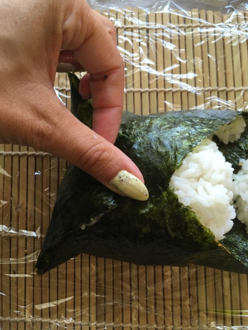 If you’ve packed your onigirazu too full (it happens) you can always do your best with one sheet, and use another sheet of nori as reinforcement. [tuck the corners up as tightly as you can, and flip the whole sandwich over onto a new piece of nori and do the corner folding thing again. Make sure you have a piece of plastic wrap underneath.]