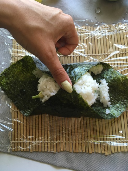 Begin to pull up corners of the nori, starting with two opposite each other first. Then pull the other two corners to meet together at close as possible, without pulling too tight that you feel like you’ll rip the nori.