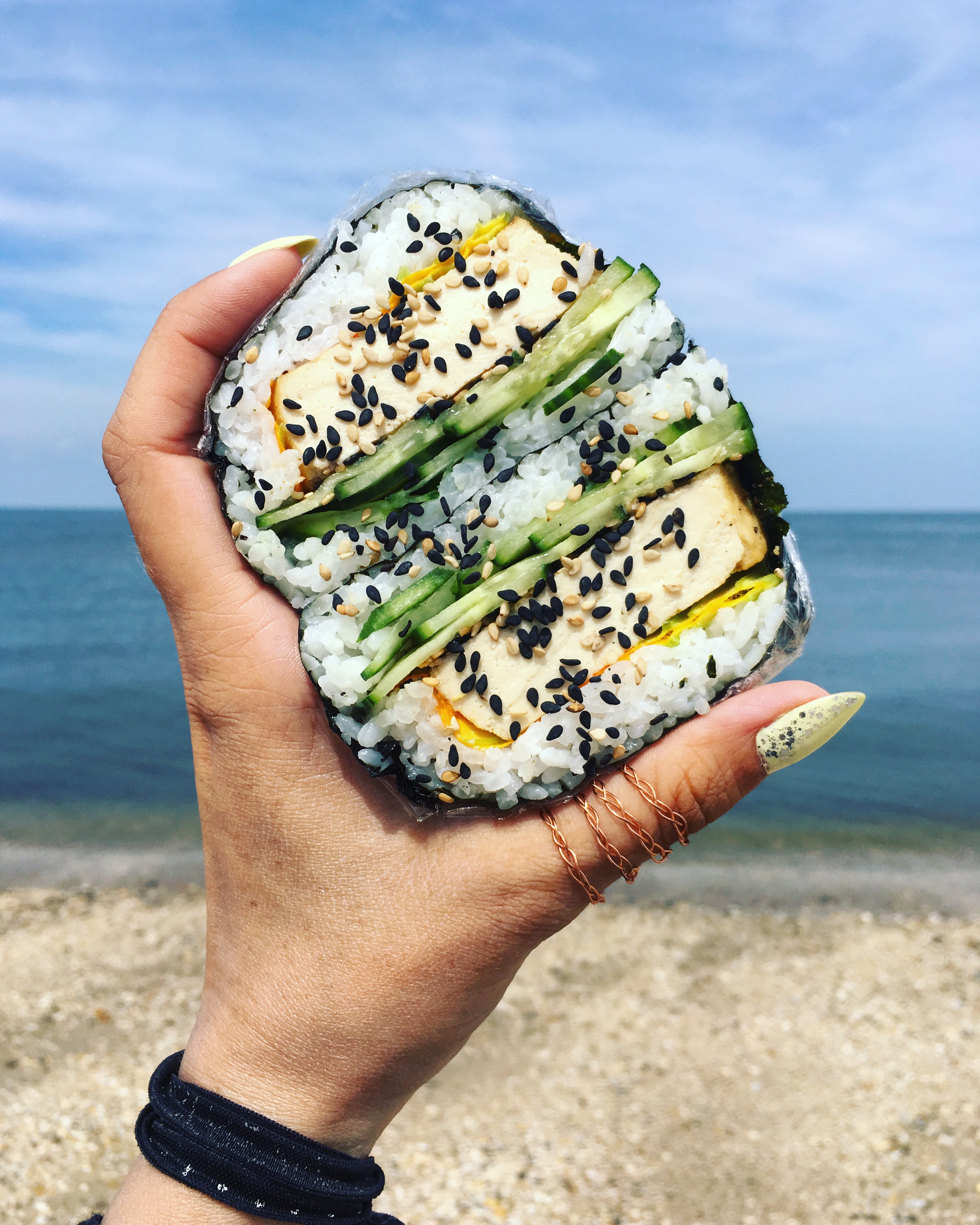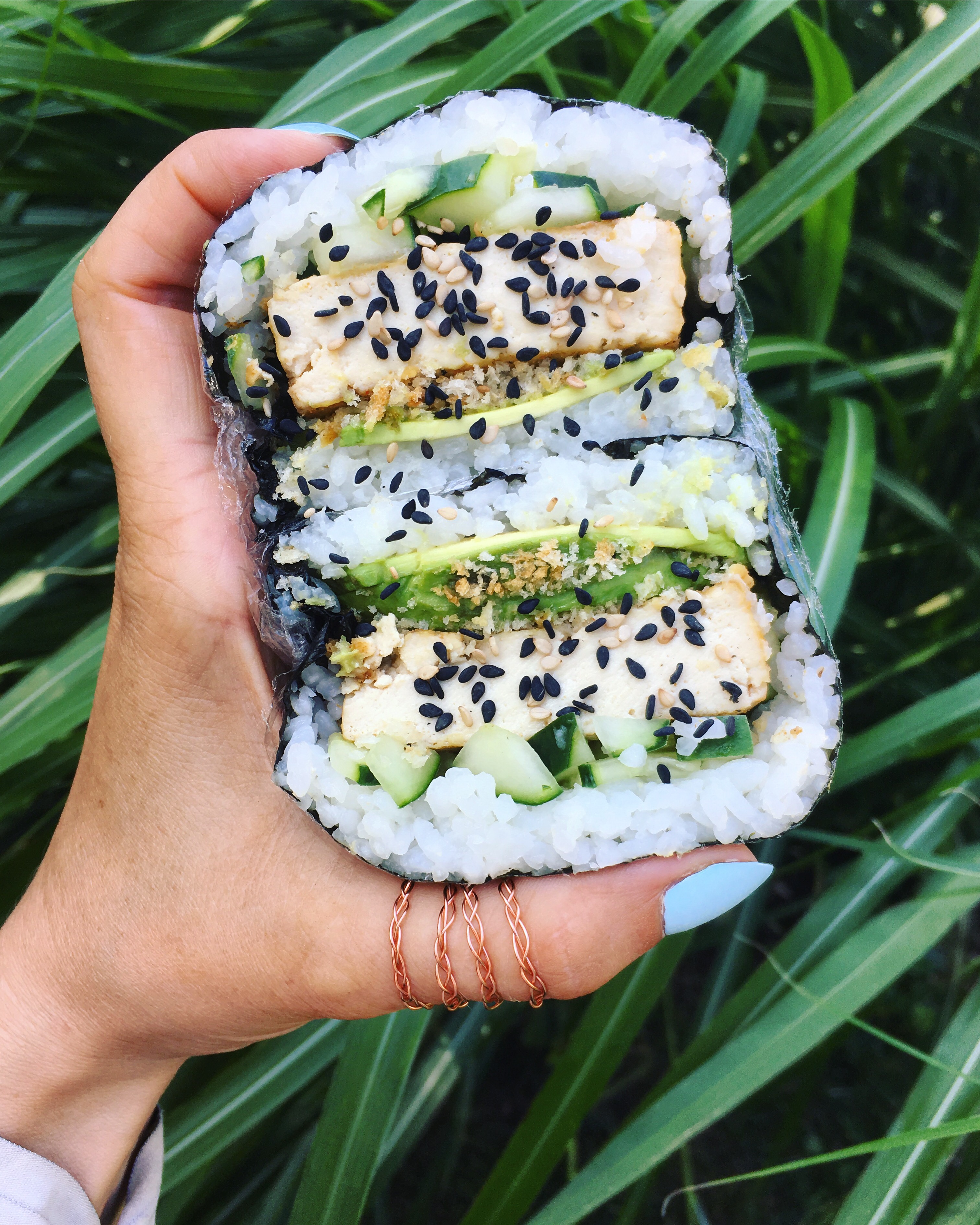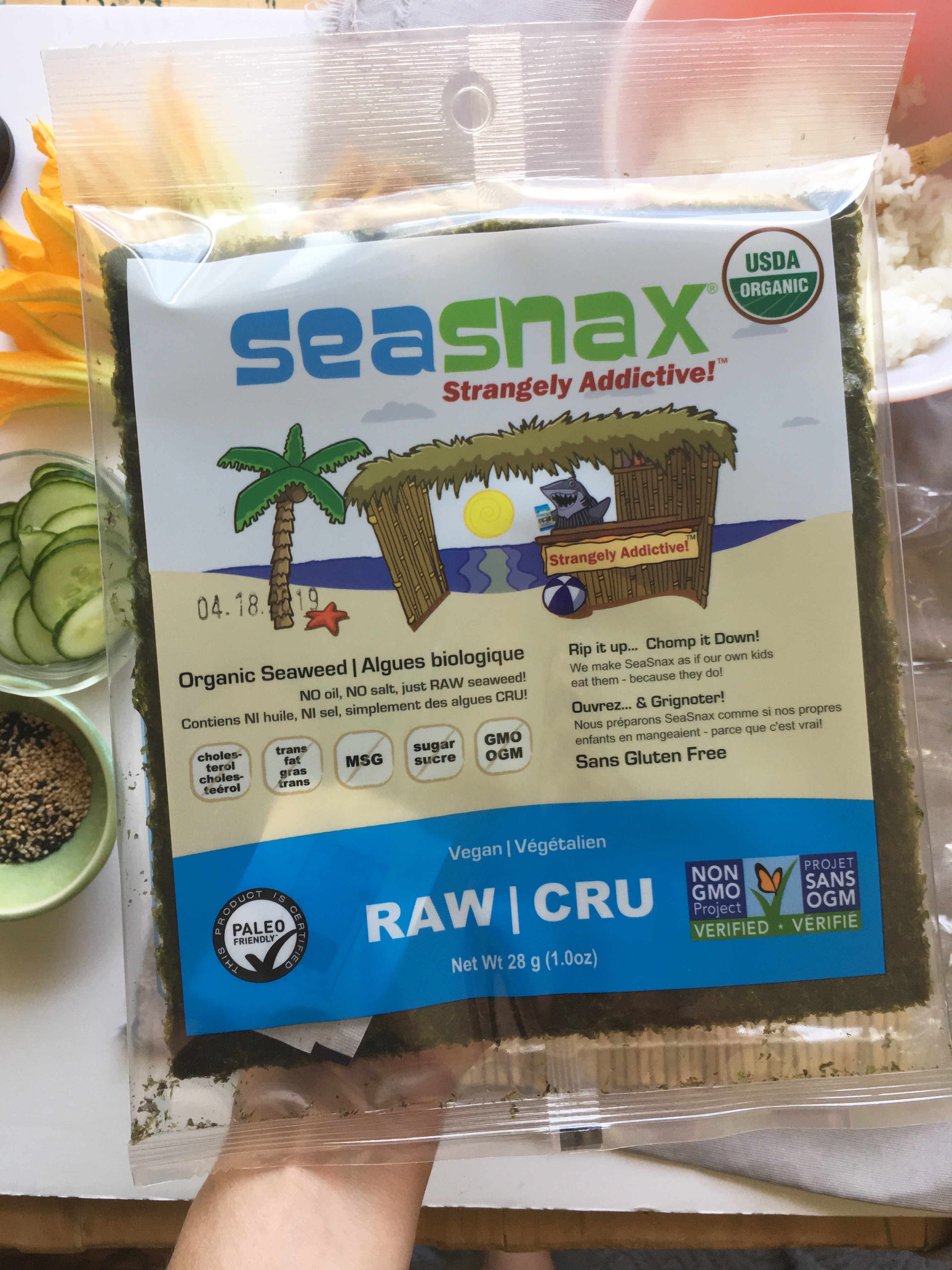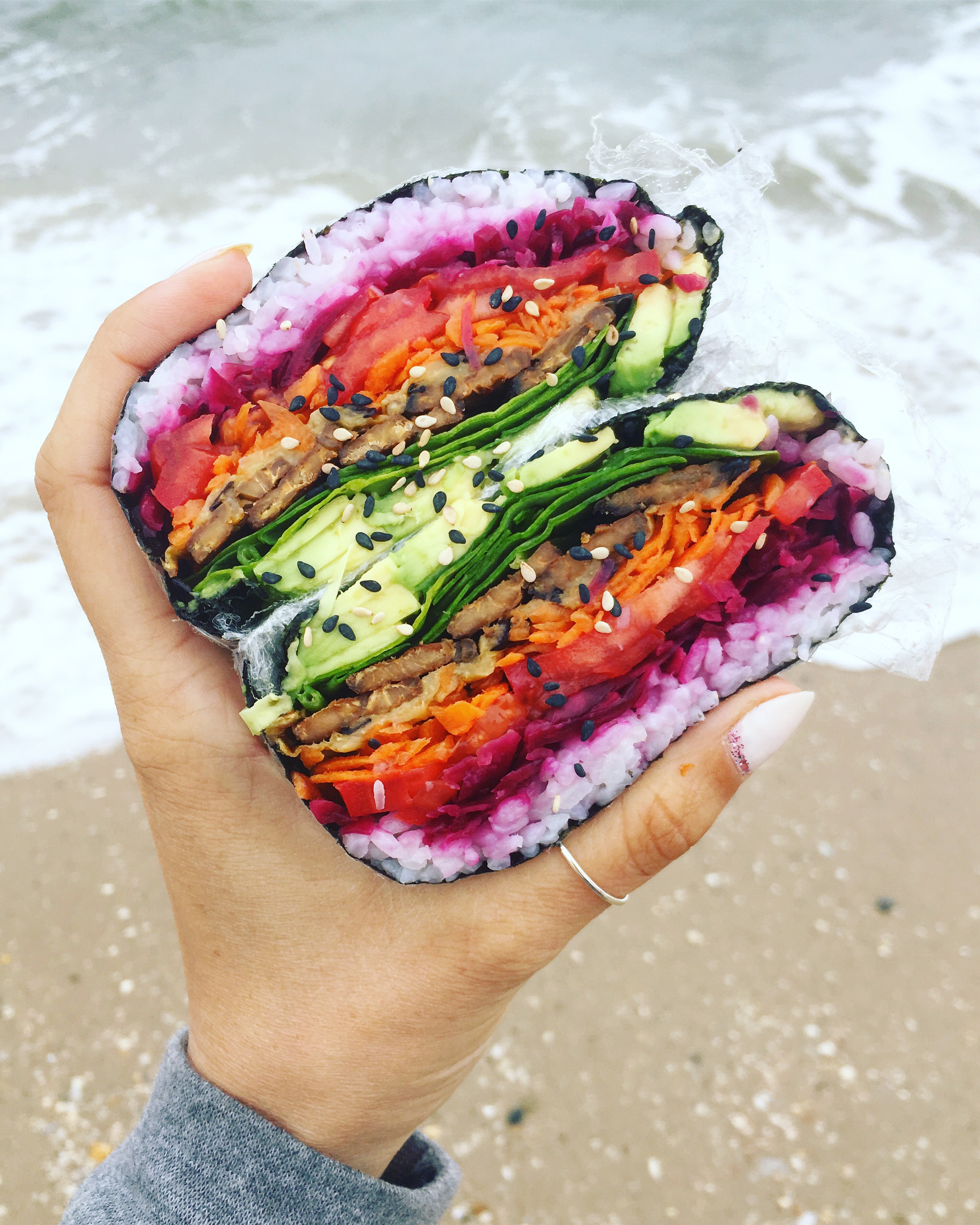 • nori – I’m using SeaSnax nori! This stuff is SO fresh. They sent me a box of goodies to test out and their raw nori folded up like a DREAM 💕 (and the little boxes of toasted nori sheets are incredibly addictive – perfect beach/ hiking/ camping/ anytime snack)