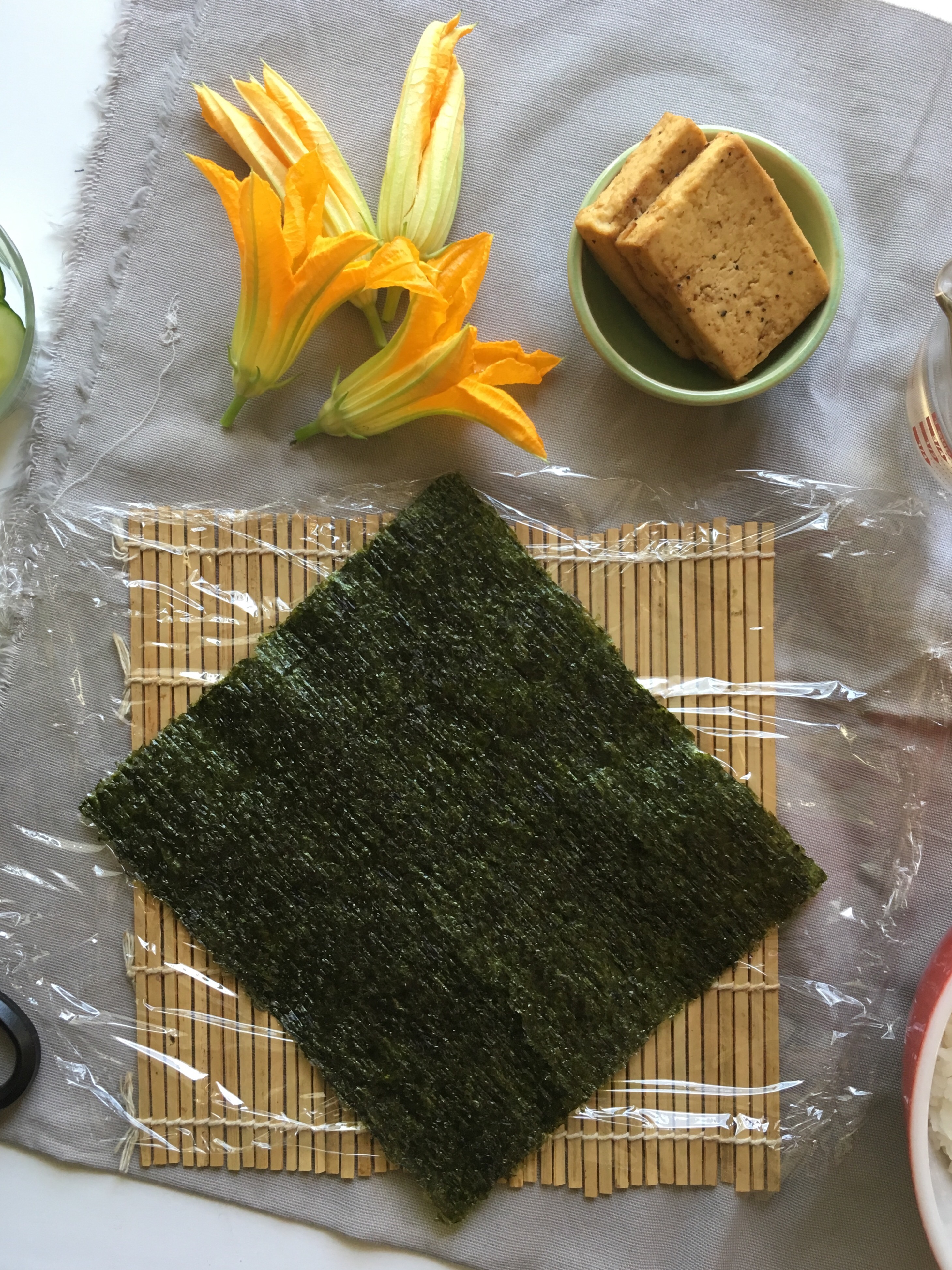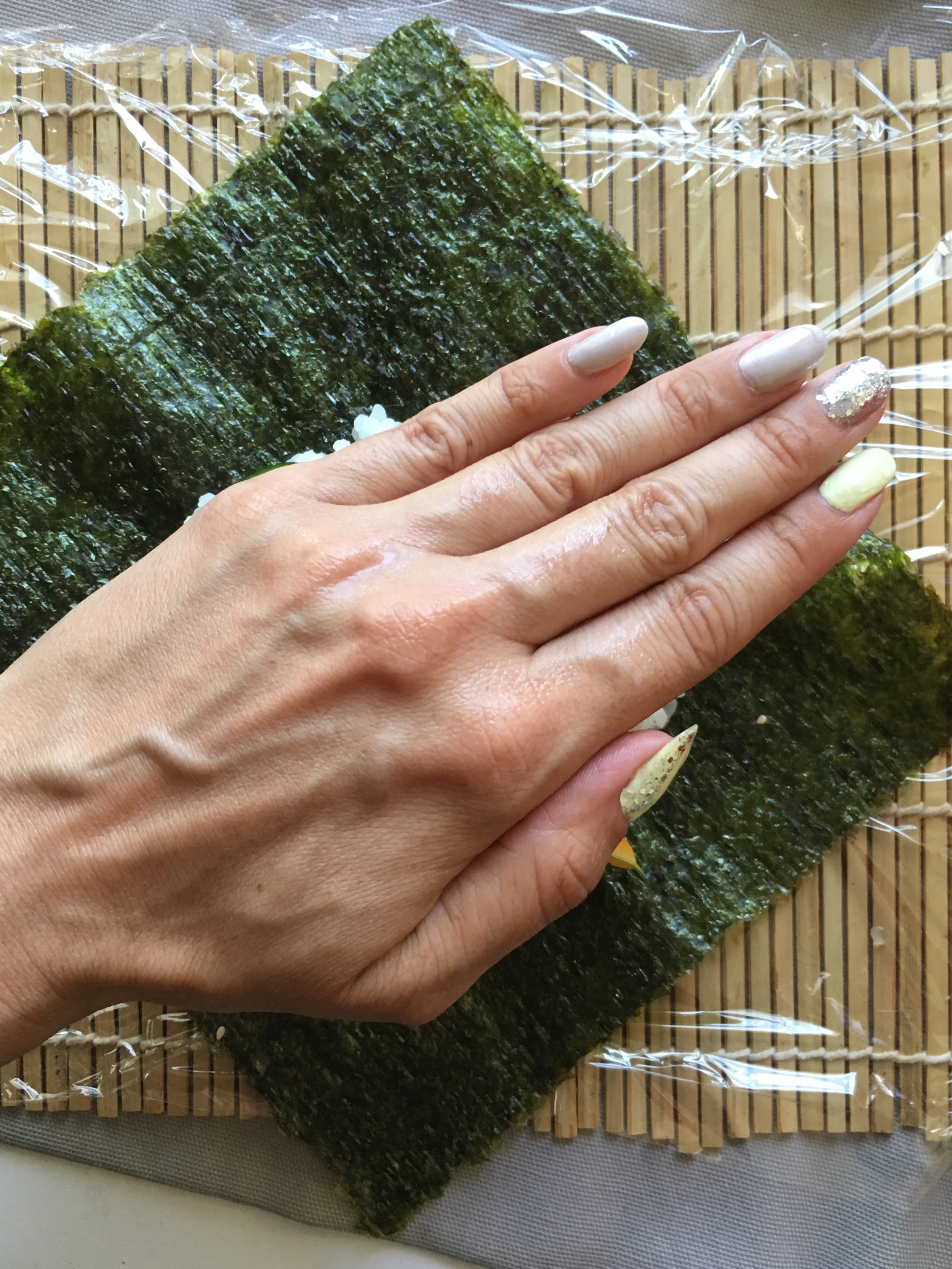 Lay down one square foot of plastic wrap on a clean, flat surface. On top of that, lay down one sheet of nori, shiny side down (like always when you’re making sushi). No, you don’t need that bamboo sushi mat I have down there; I just used it for aesthetics.