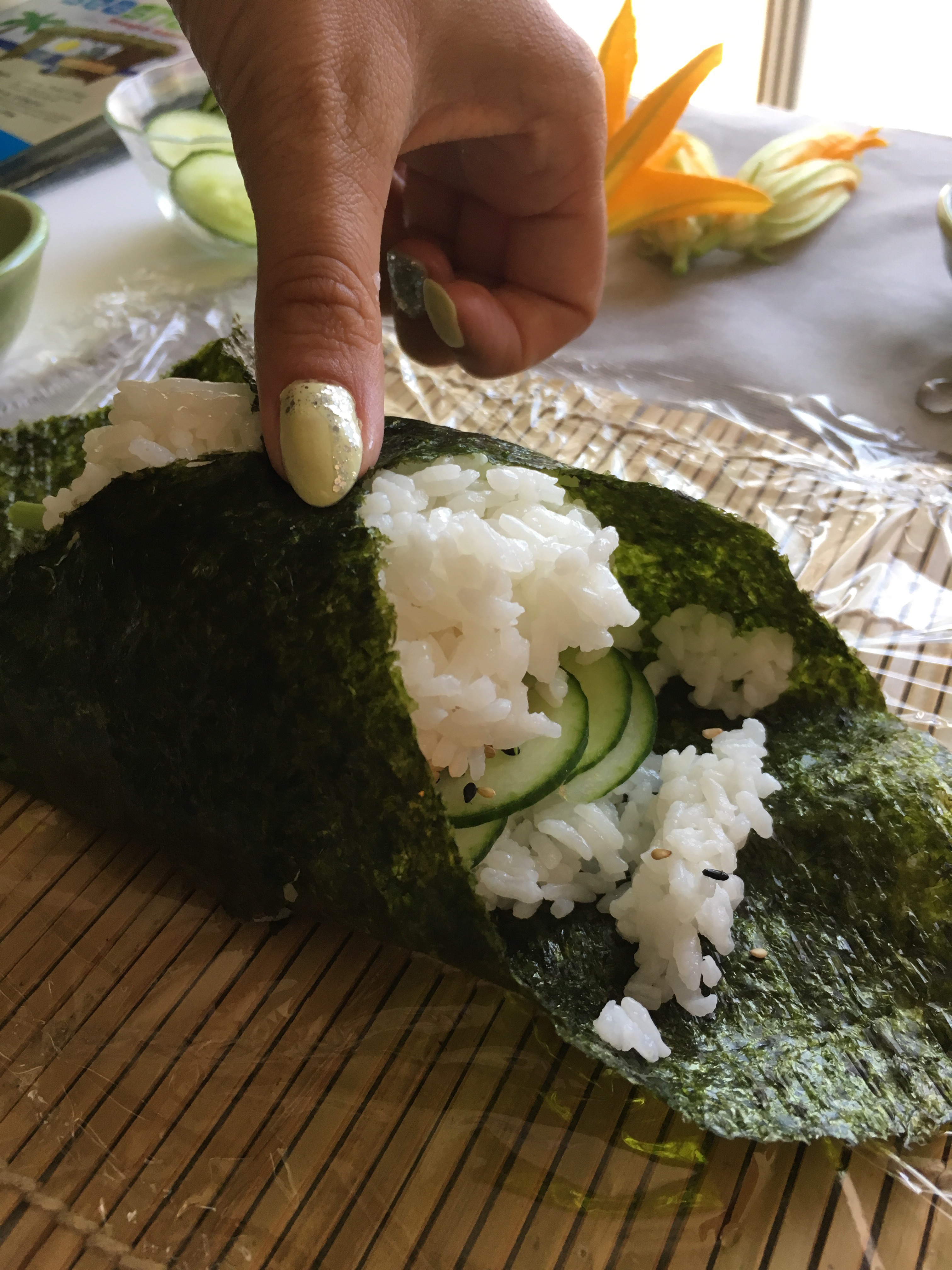 Have a kitchen towel nearby, a small bowl filled with lukewarm water to dip your hands in, your sushi rice, and all your sushi filling ingredients ready to go.