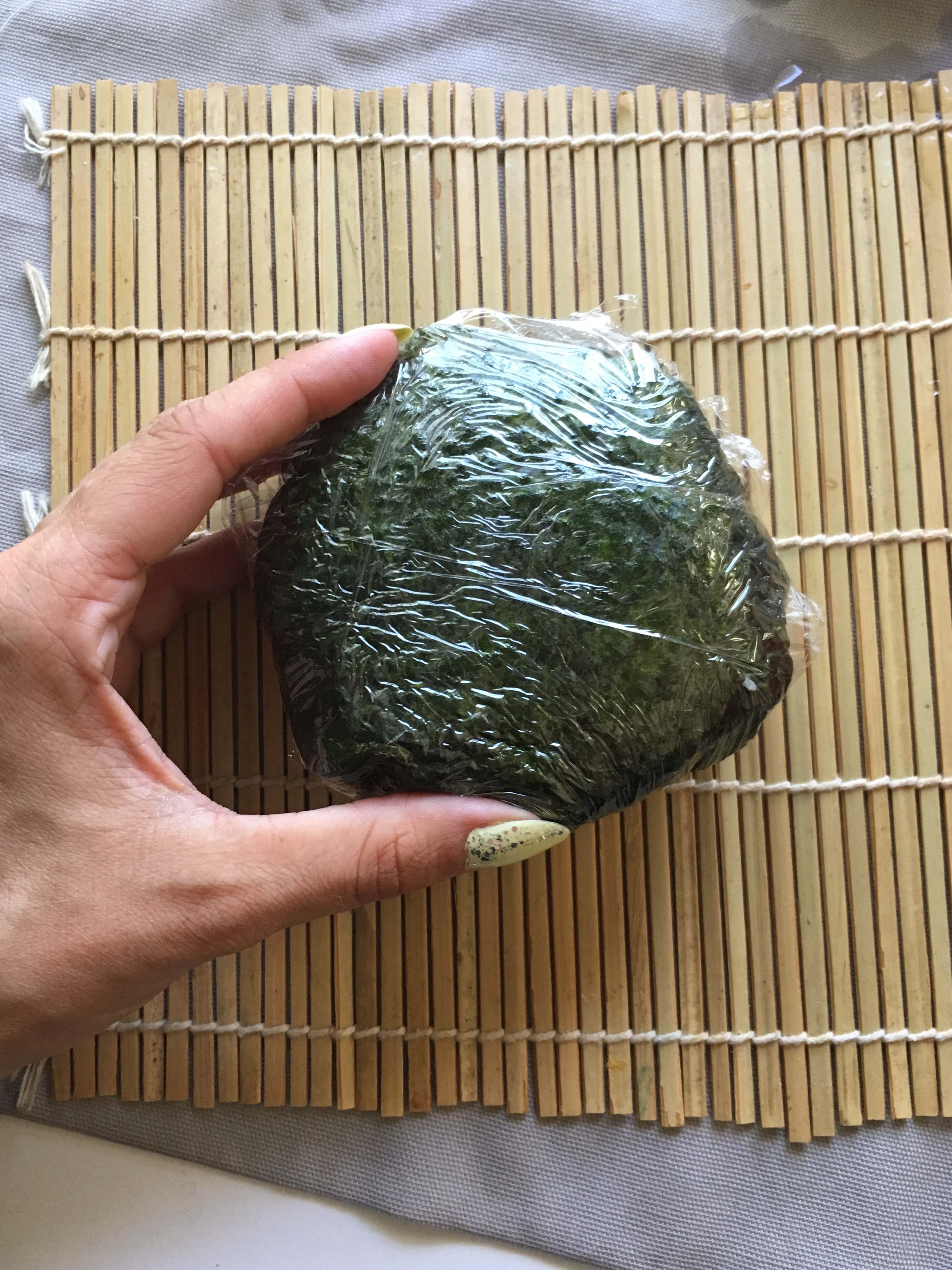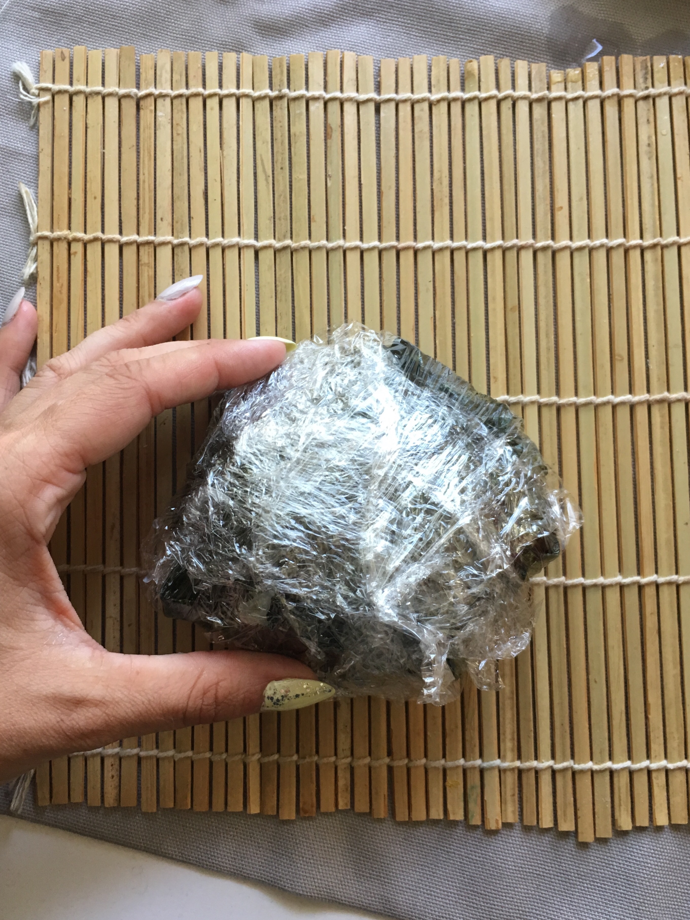 The plastic wrap helps to soften the nori. I’m sure you’ll realize if your nori isn’t super fresh (not a problem with the SeaSnax!) it feels a bit flaky or crunchy as you’re folding it, right?…wondering how the heck it’s going to wrap around and stay so neatly…giving it some time wrapped in the plastic will 100% soften it up. The moisture from the rice and whatever veggies you use will transfer to the nori right away.