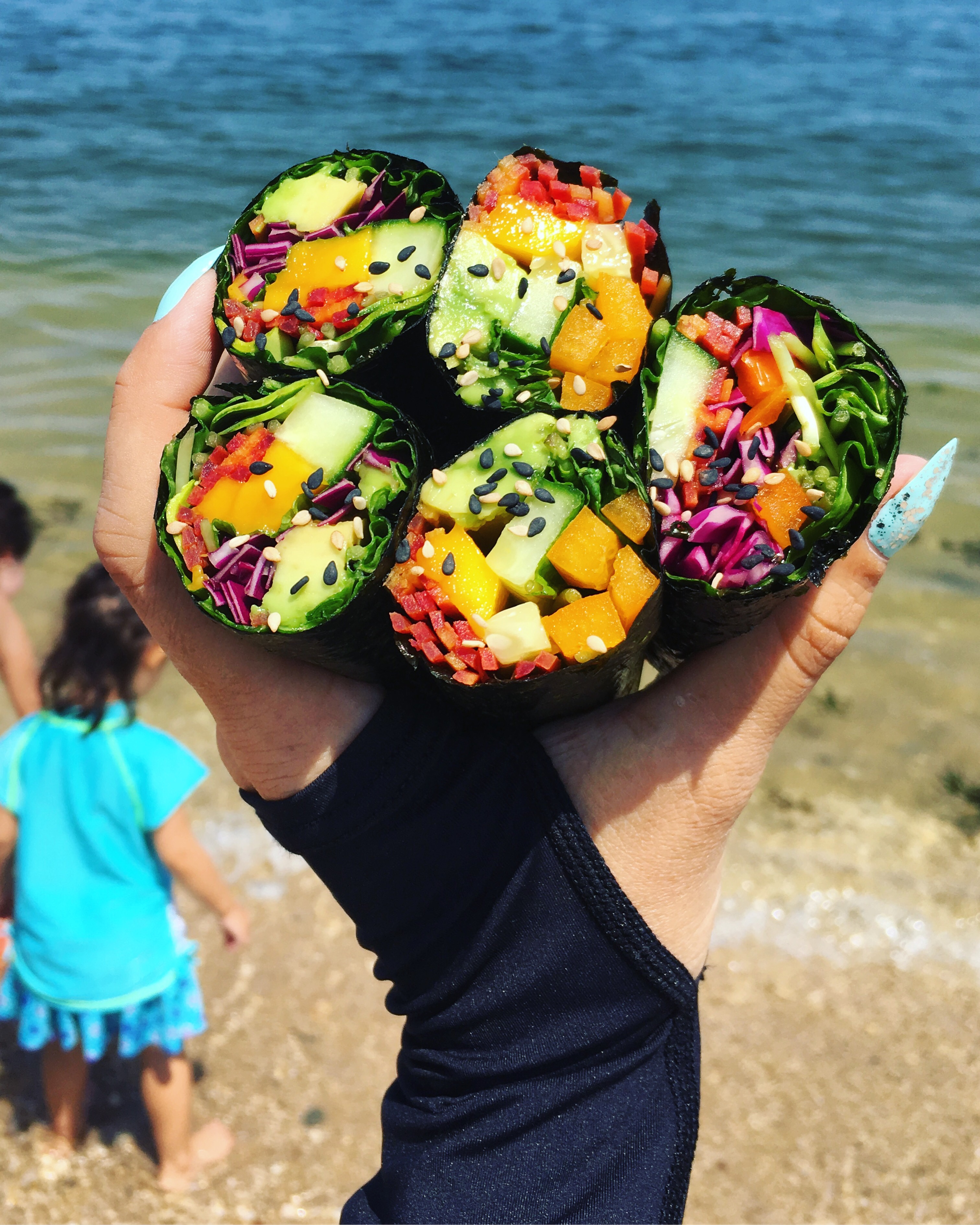 My kids love helping me make these! I let them lay down the strips of veggies on the nori and then I roll it up and set it aside to wait to be sliced. It usually ends in me yelling to stop touching the knives or them fighting over bell pepper strips or some other minor chaos, but it’s fun as long as it lasts. (and yes I bought a rash guard bathing suit top because I wanted an extra layer of sun protection at the beach! Spending the last 9-10 years in Vermont, I got really spoiled not having to worry so much about slathering sunblock all over. This was the first year since 2006ish that I spent pretty much the entire summer on Long Island and I got way too tan. Those long sleeves really did help! My kids love wearing them too.)