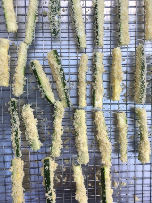When you’ve coated all your veggies, bake them in the oven at 400 F on the mid-lower rack for about 15 minutes, then turn up the temperature to 425 F for the last 5-10 minutes to get the breading golden brown.